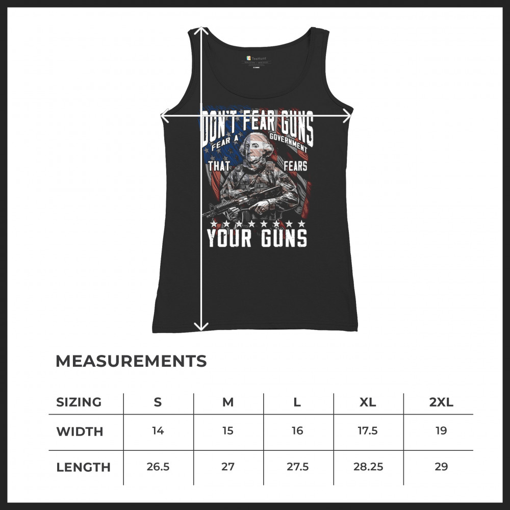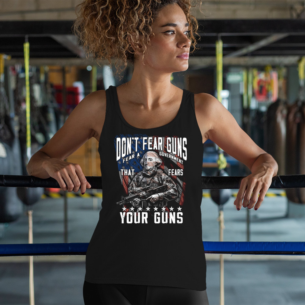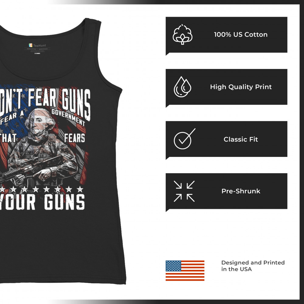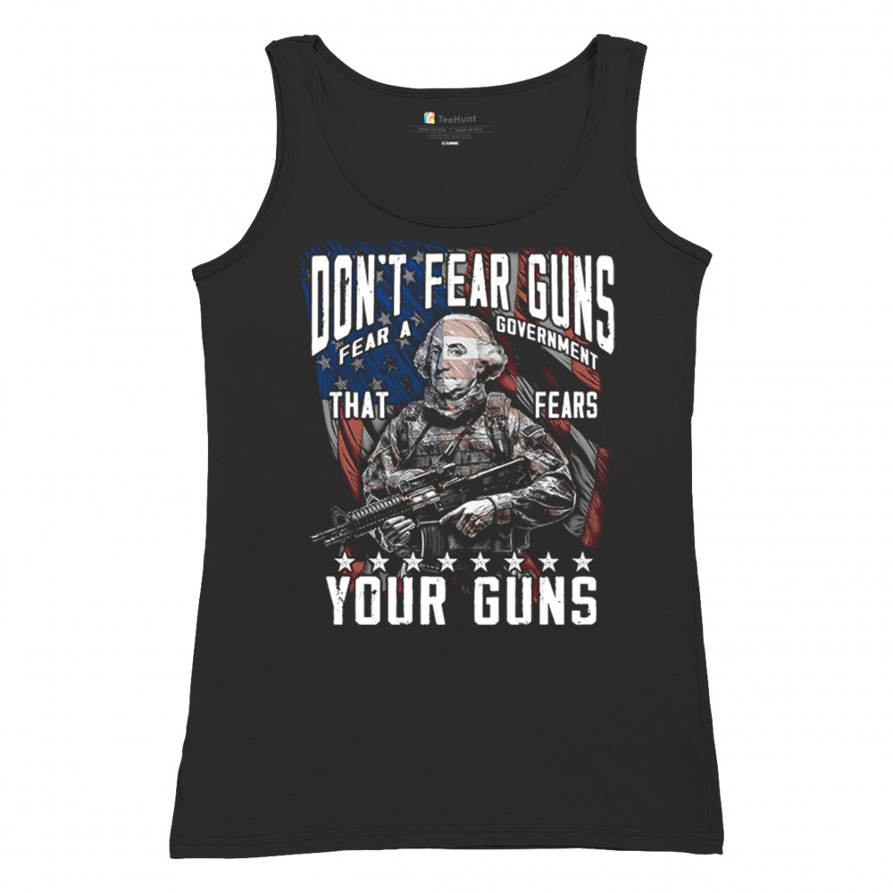 A fierce tribute to liberty, this design shows George Washington armed in tactical gear with the message "Don't Fear Guns, Fear a Government That Fears Your Guns." Perfect for 2nd Amendment patriots, protestors, and anyone who believes in self-defense and personal freedom. A bold, graphic statement for gun rights and political awareness.