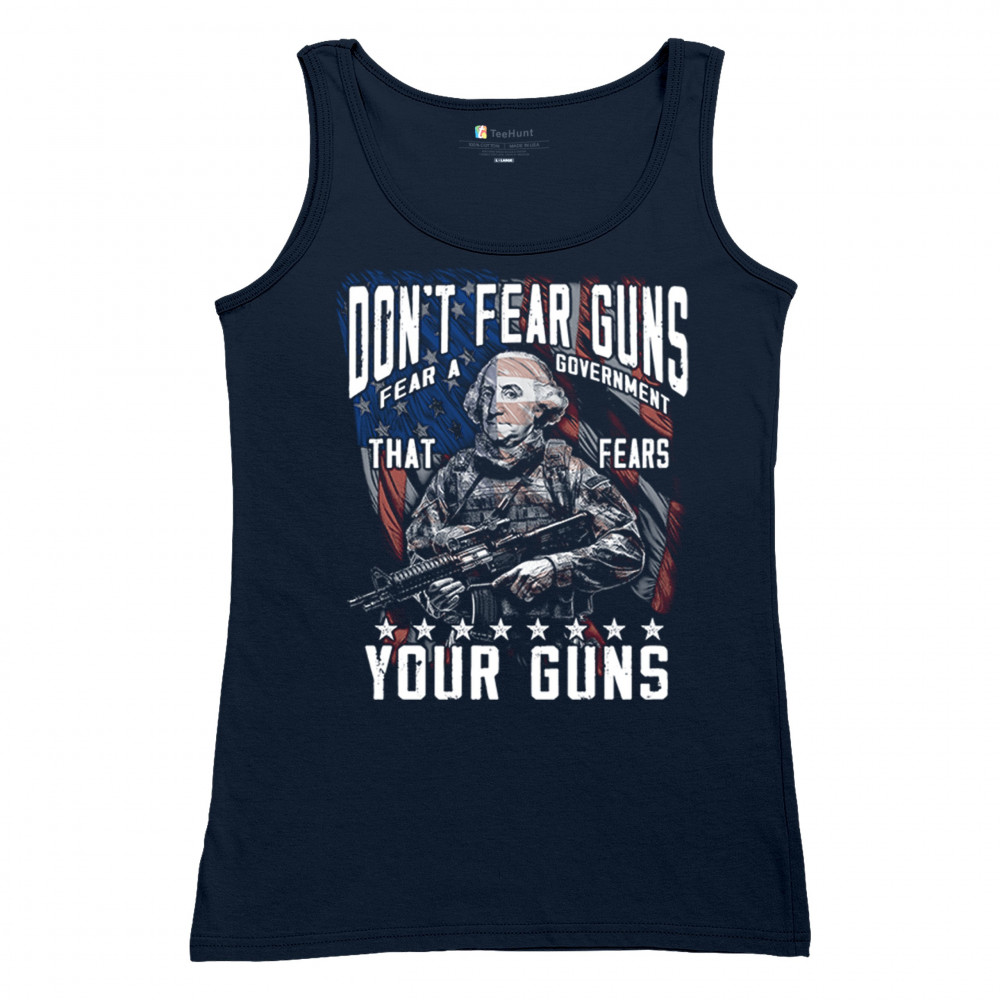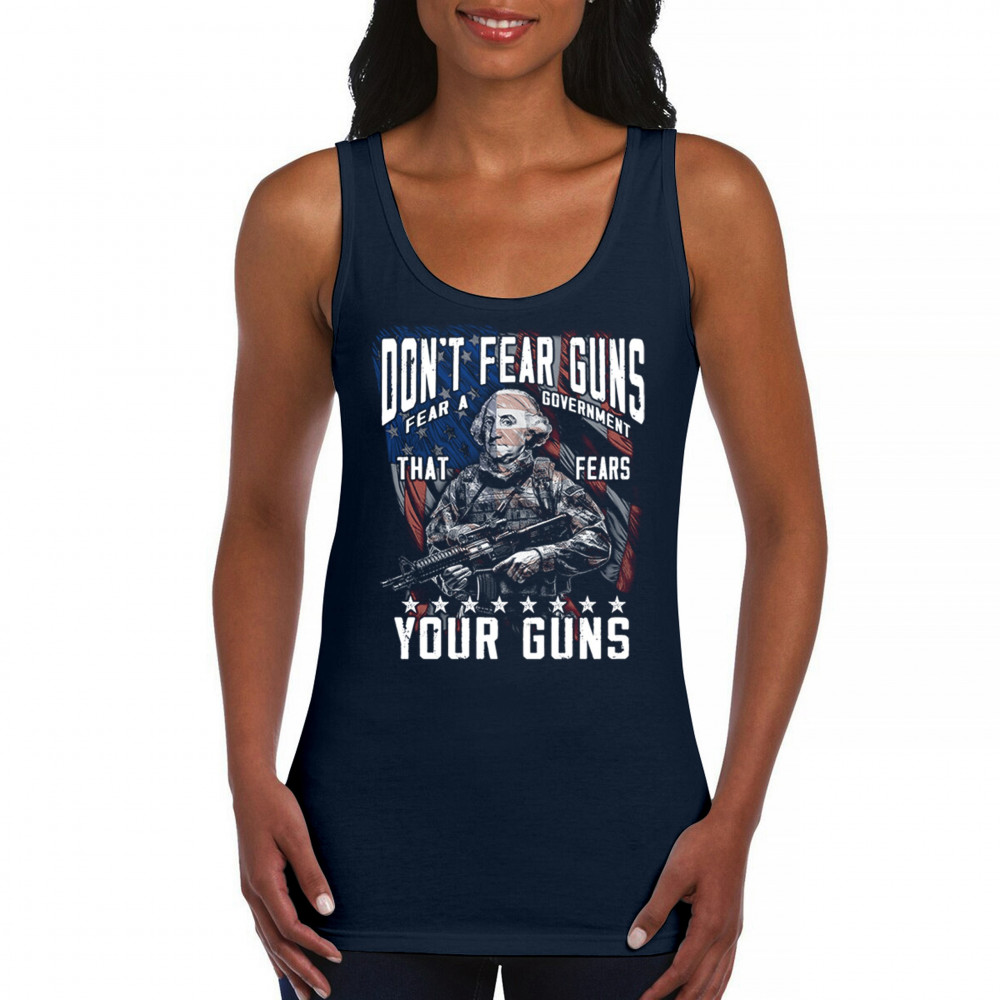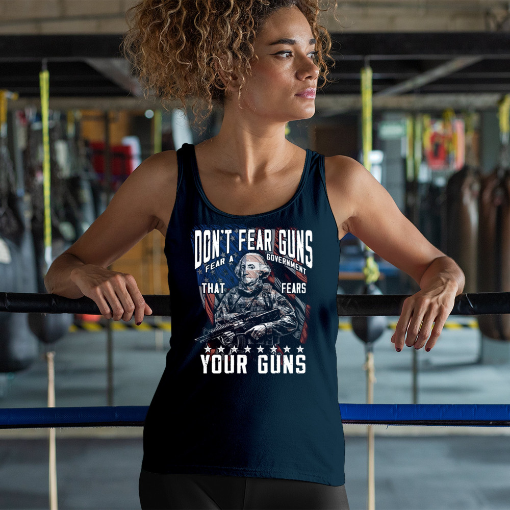 A fierce tribute to liberty, this design shows George Washington armed in tactical gear with the message "Don't Fear Guns, Fear a Government That Fears Your Guns." Perfect for 2nd Amendment patriots, protestors, and anyone who believes in self-defense and personal freedom. A bold, graphic statement for gun rights and political awareness.