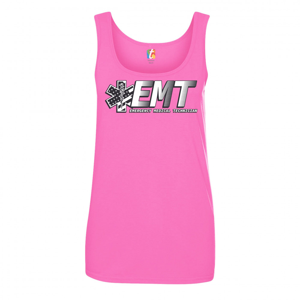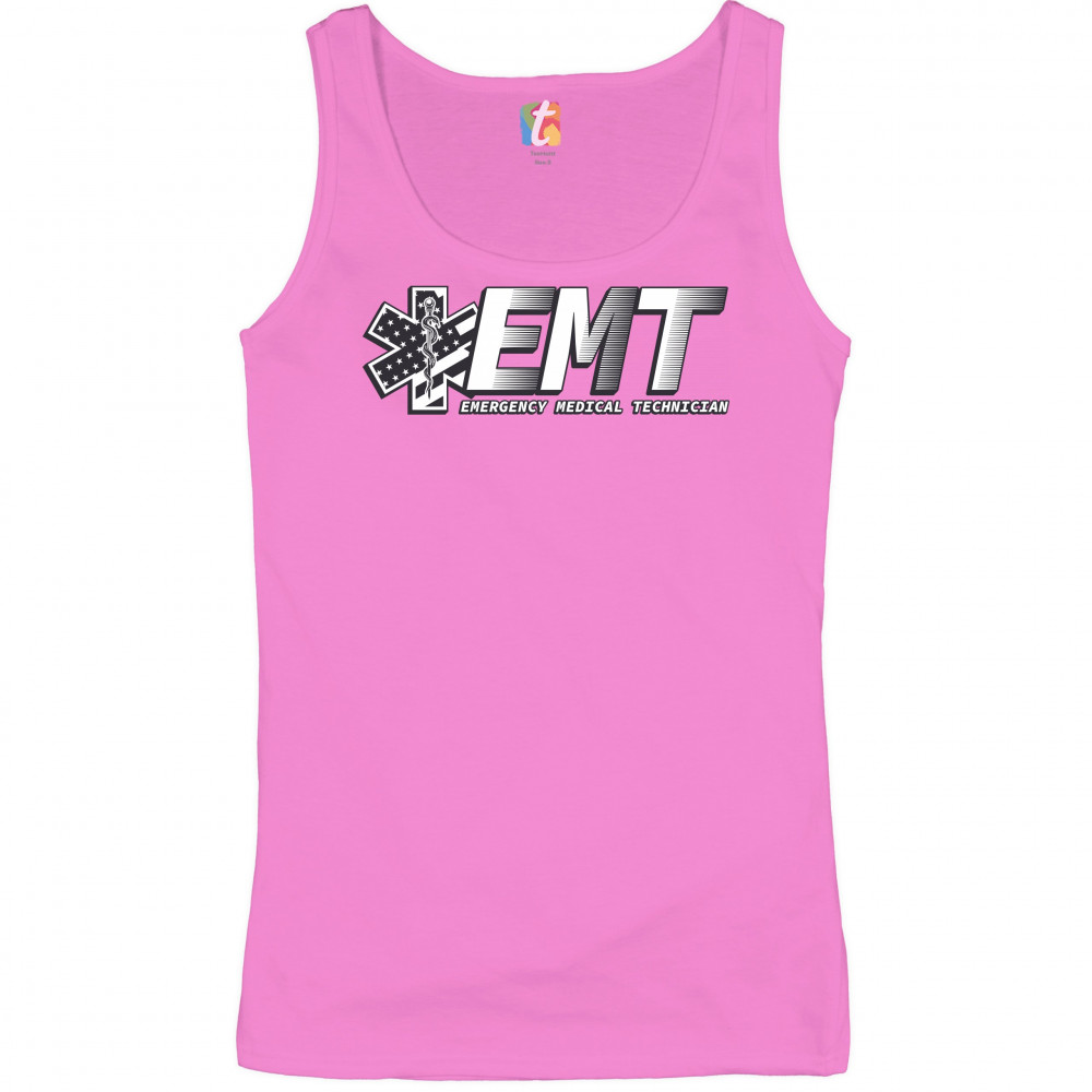 A print featuring big letters "EMT" - an abbreviation for "Emergency Medical Technician". On the left side the print features a Star of Life, the worldwide recognized symbol of emergency medical services, with the Rod of Asclepius and Stars and Stripes in