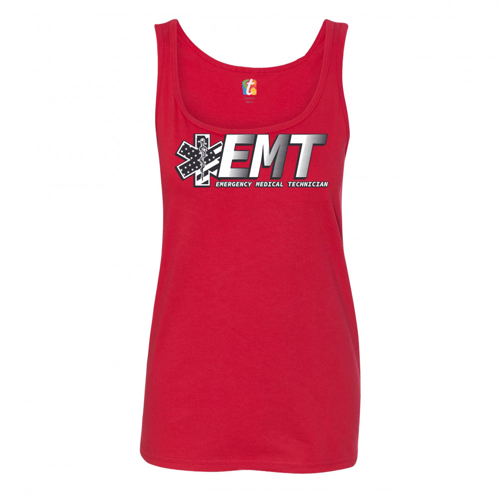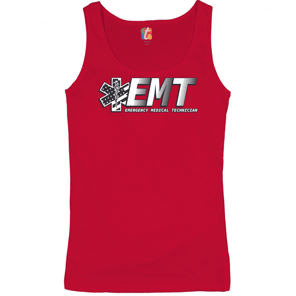 A print featuring big letters "EMT" - an abbreviation for "Emergency Medical Technician". On the left side the print features a Star of Life, the worldwide recognized symbol of emergency medical services, with the Rod of Asclepius and Stars and Stripes in