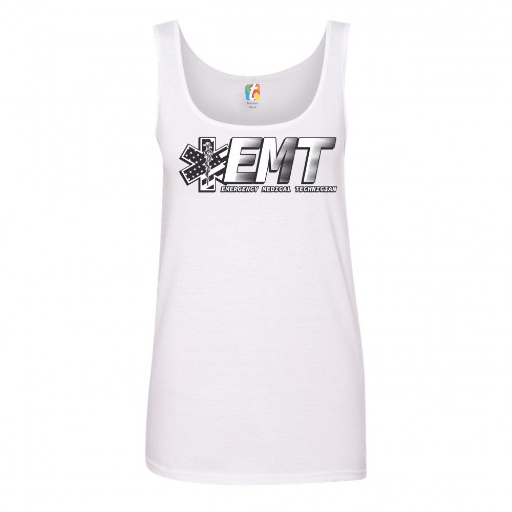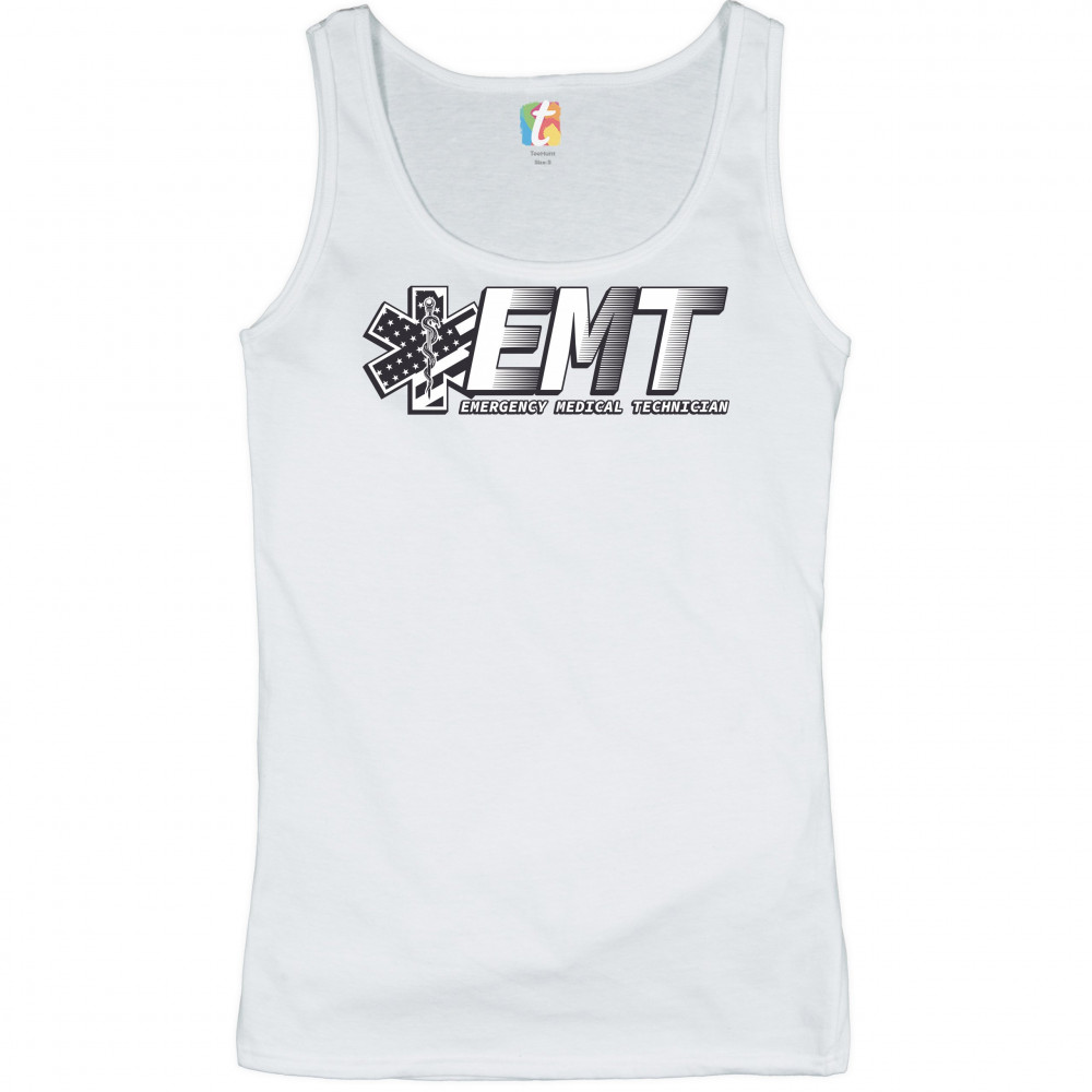 A print featuring big letters "EMT" - an abbreviation for "Emergency Medical Technician". On the left side the print features a Star of Life, the worldwide recognized symbol of emergency medical services, with the Rod of Asclepius and Stars and Stripes in