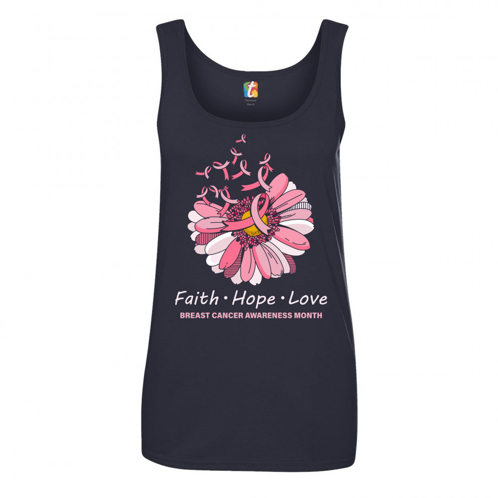FAITH HOPE LOVE women's tank top breast cancer awareness month ribbon flower navy blue