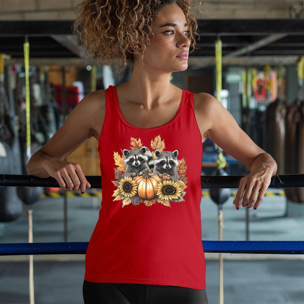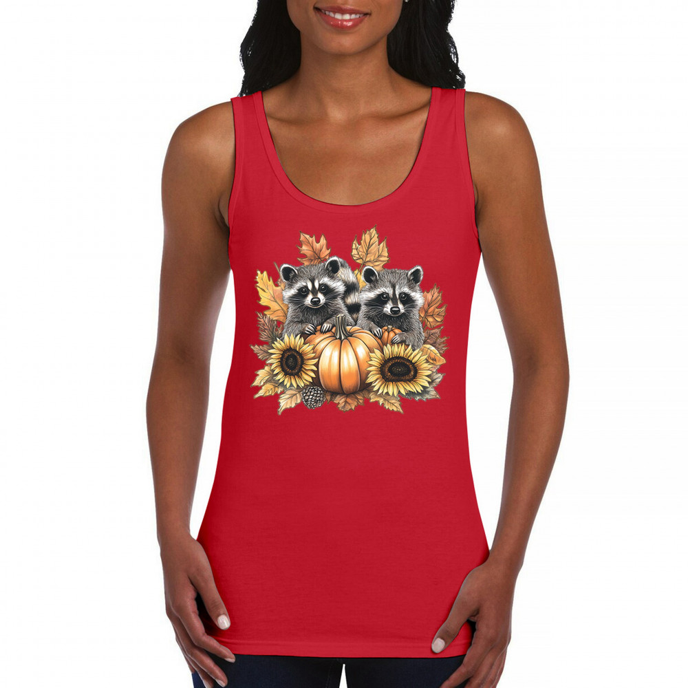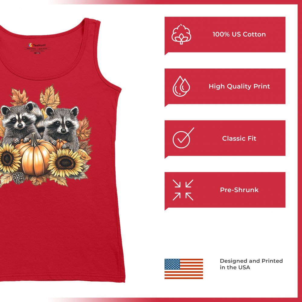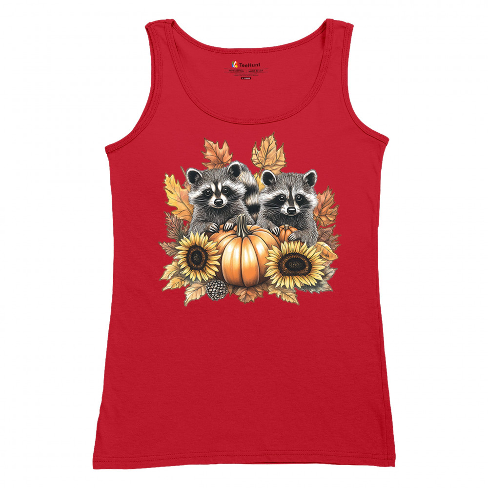 Rustic autumn raccoon design with pumpkins and sunflowers. Perfect for Thanksgiving, pumpkin patch days, farmhouse harvest, and woodland fall fashion.