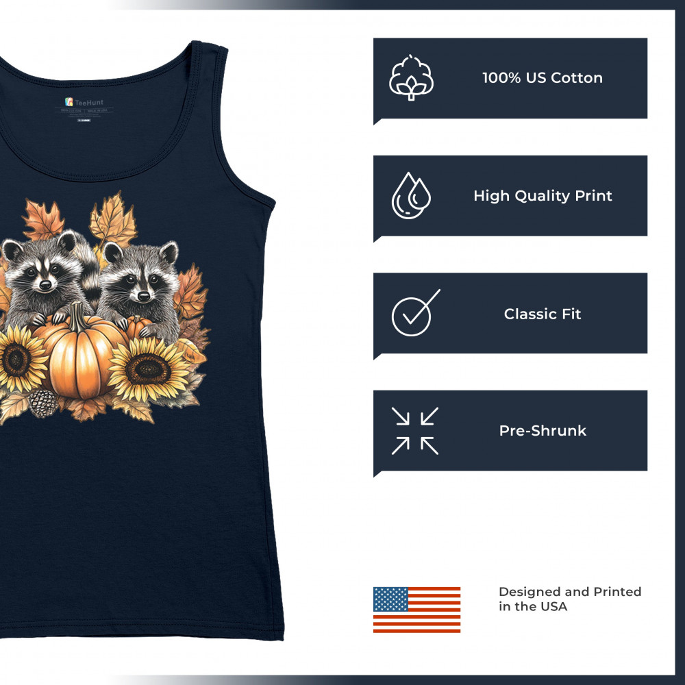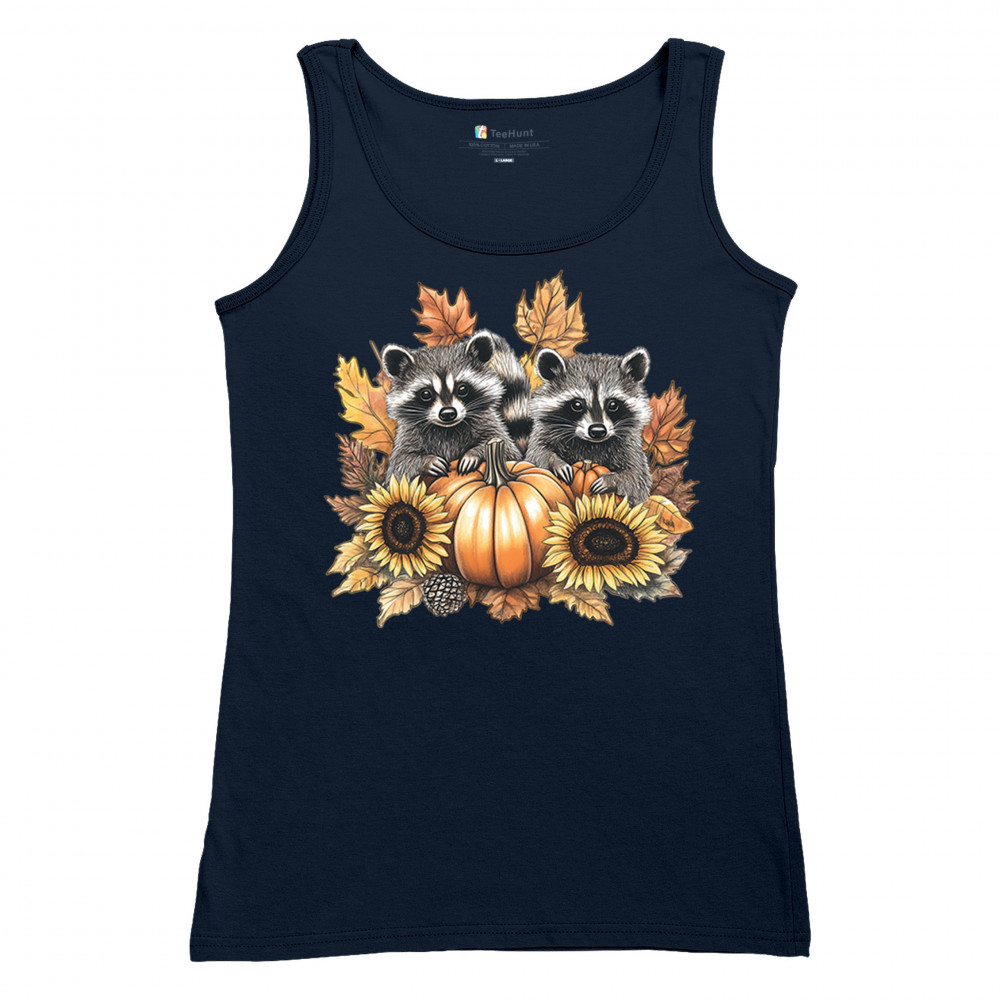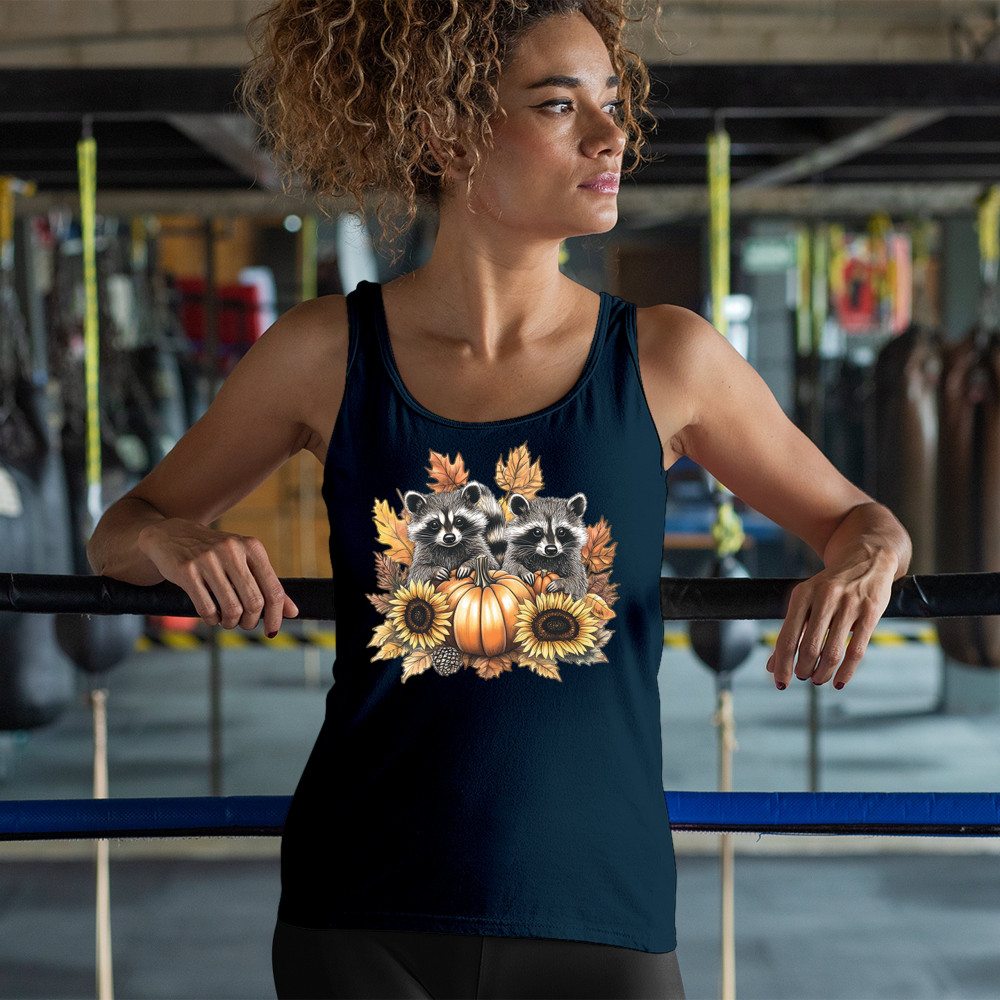 Rustic autumn raccoon design with pumpkins and sunflowers. Perfect for Thanksgiving, pumpkin patch days, farmhouse harvest, and woodland fall fashion.