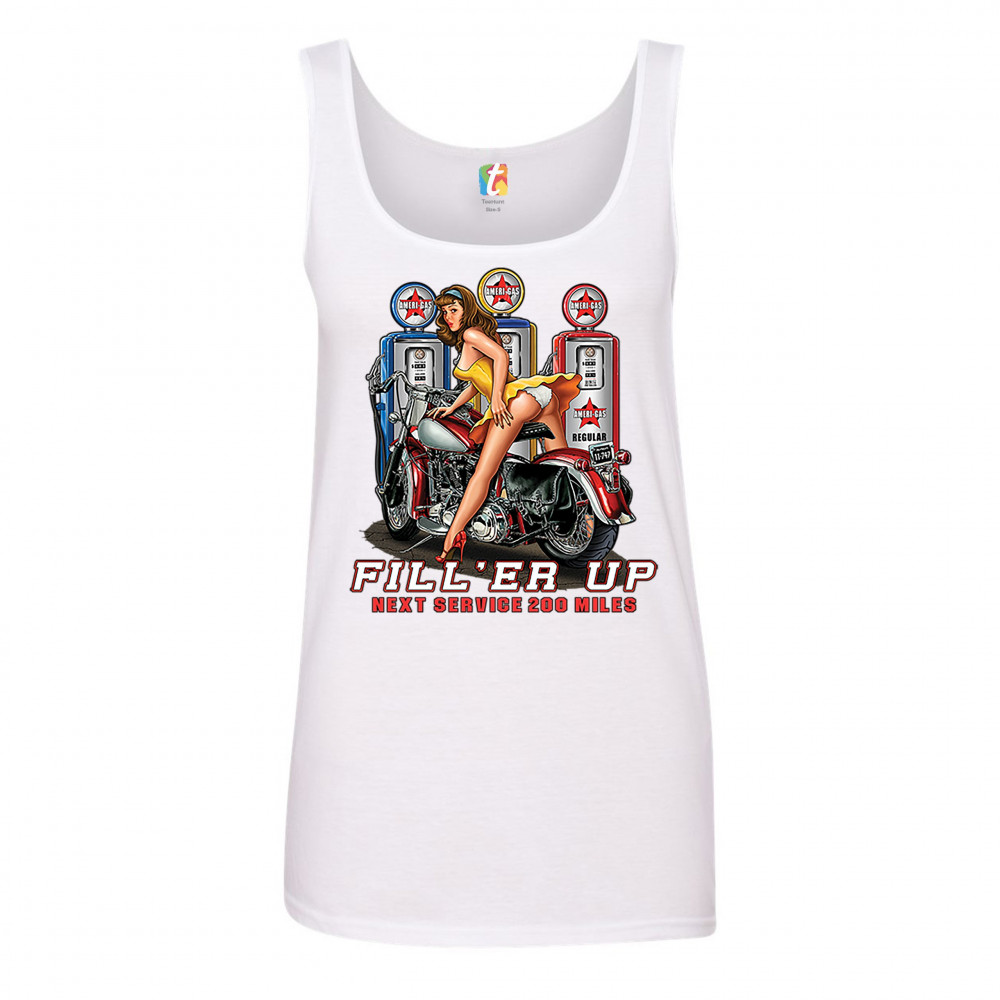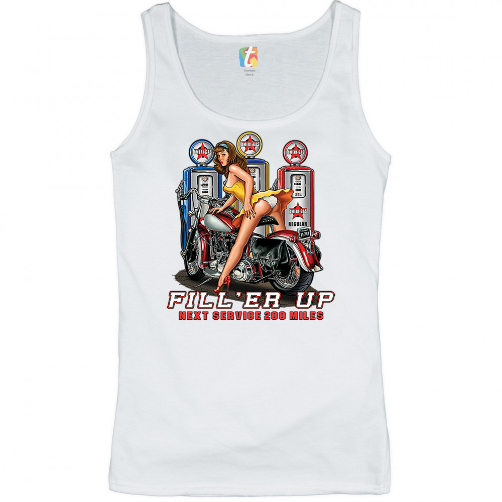 FILL 'ER UP women's tank top sexy pin-up girl biker rider live to ride white