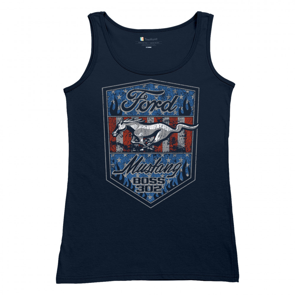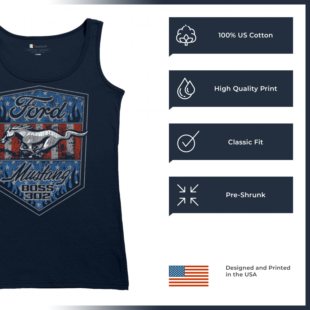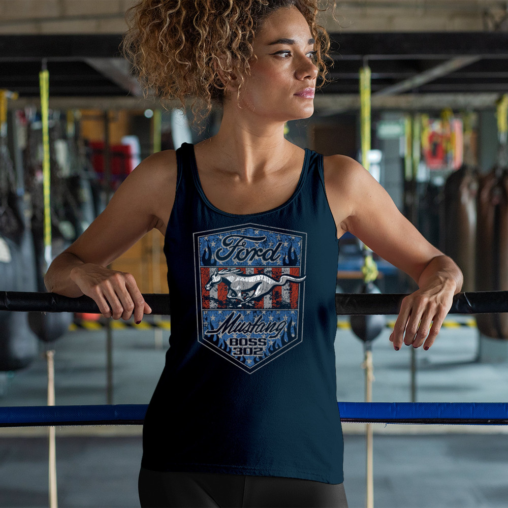 Honor the Ford Mustang Boss 302 legacy with this officially licensed patriotic design, featuring bold flames, the iconic running Mustang, and vintage American muscle style.