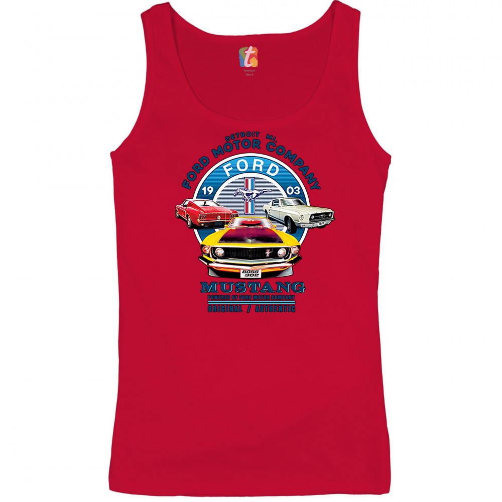 A print featuring three classic Ford Mustangs and their logo in the center. The print says: "Detroit Mi. Ford Motor Company, 1903 Ford Mustang, Powered by Ford Motor Company, Original/Authentic". A great choice for anyone who is a fan of old school Ford M