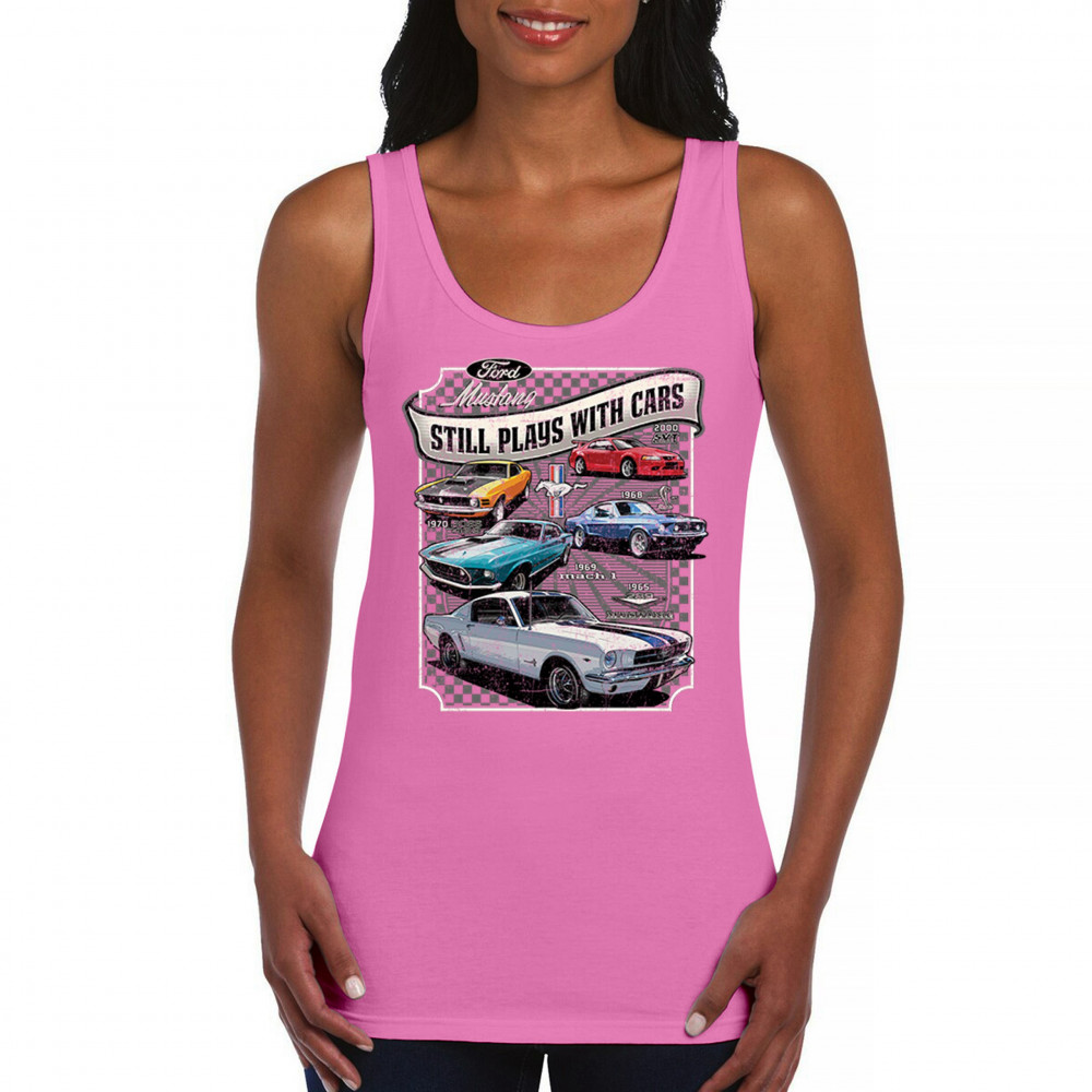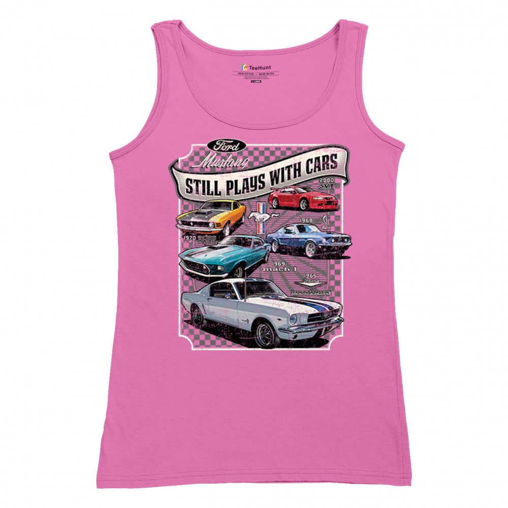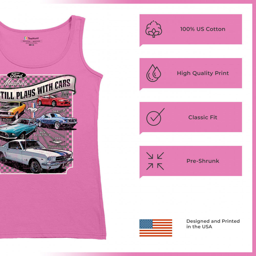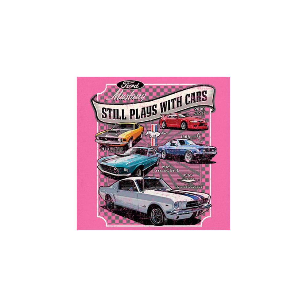 This bold Ford Mustang "Still Plays With Cars" design showcases six classic models from 1965 to 2000, including the 1969 Mach 1, 1970 Boss 302, and 2000 SVT. A dream graphic for muscle car lovers, collectors, and pony car fans. Great for classic auto shows, retro cruises, garage wear, or car clubs.