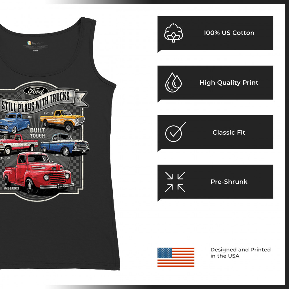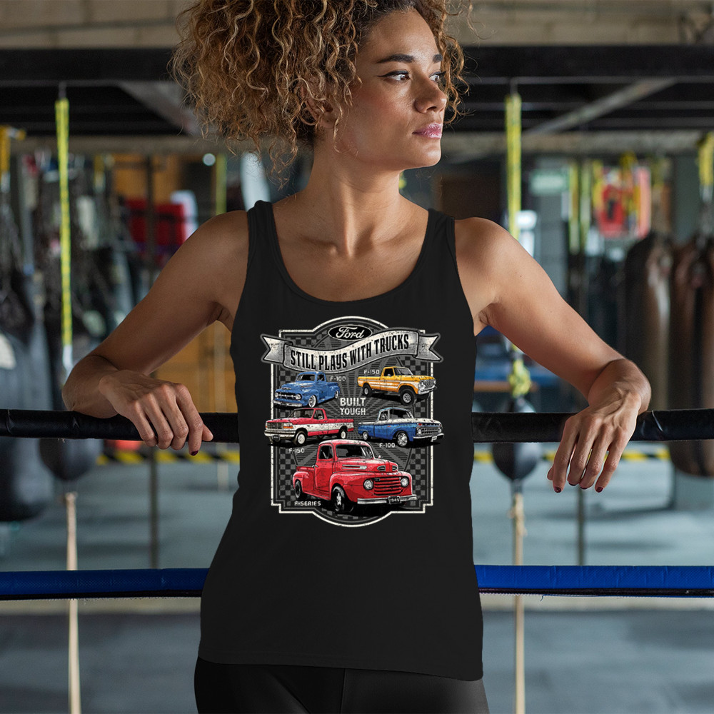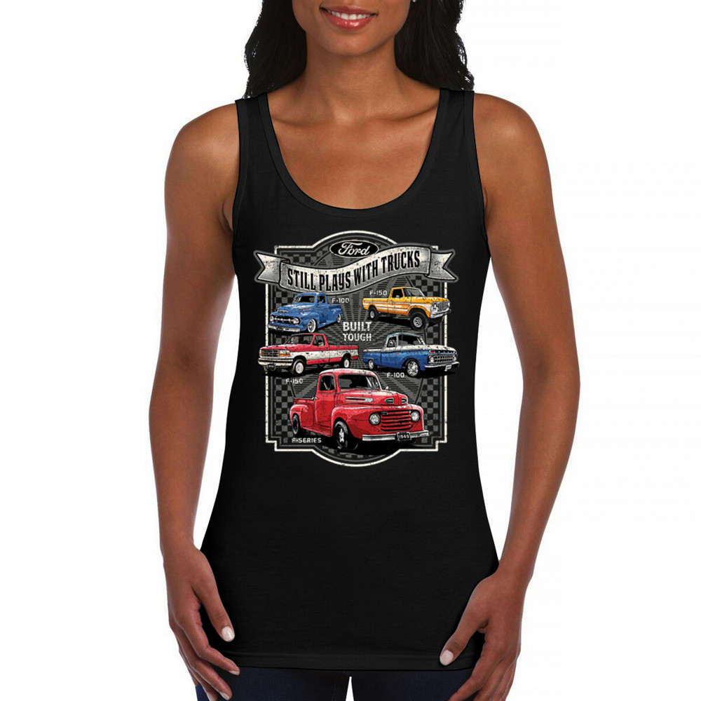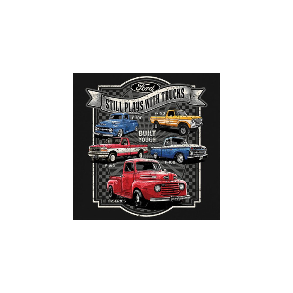 Features classic Ford F-Series trucks from 1949 to F-150. Great for vintage truck fans, garage wear, car shows, and collectors who love pickups.