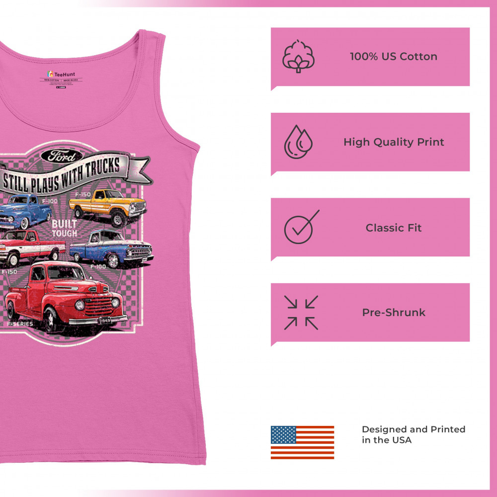 Features classic Ford F-Series trucks from 1949 to F-150. Great for vintage truck fans, garage wear, car shows, and collectors who love pickups.