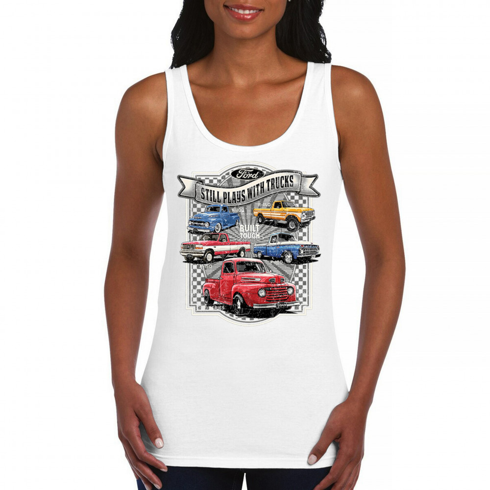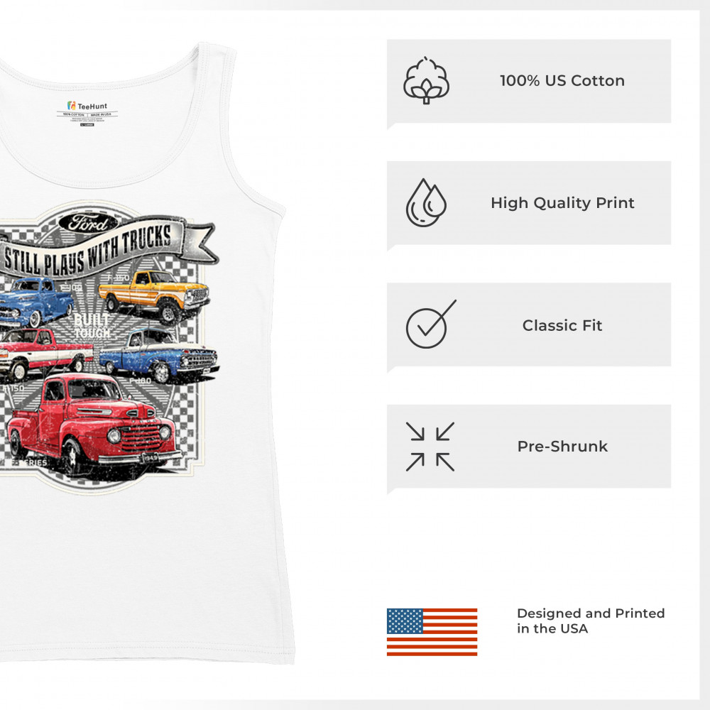 Features classic Ford F-Series trucks from 1949 to F-150. Great for vintage truck fans, garage wear, car shows, and collectors who love pickups.