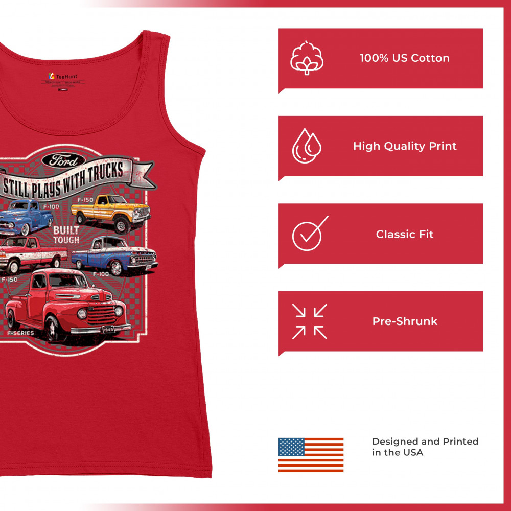 Features classic Ford F-Series trucks from 1949 to F-150. Great for vintage truck fans, garage wear, car shows, and collectors who love pickups.