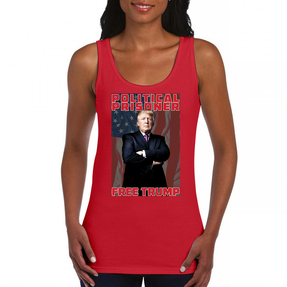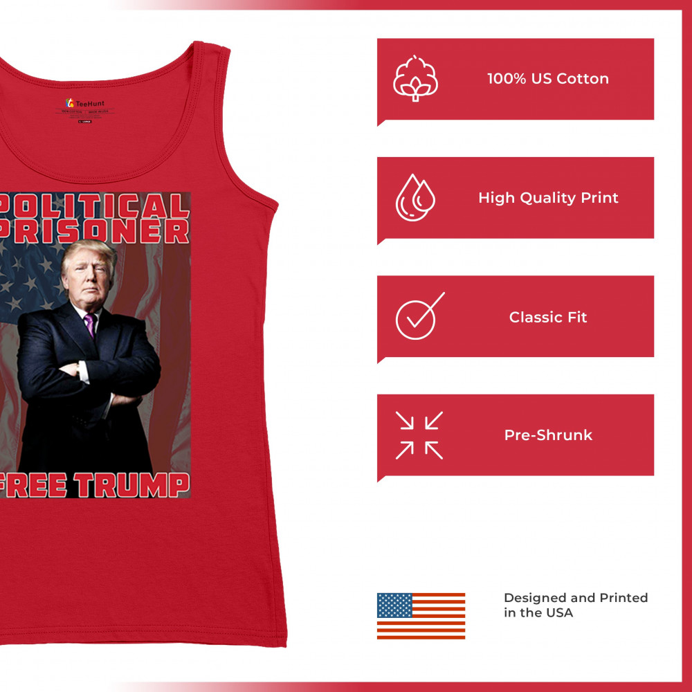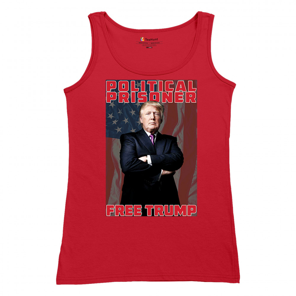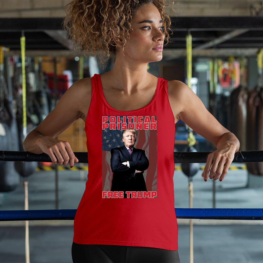 Show your support with the "Political Prisoner Free Trump" design, featuring Trump against an American flag. Perfect for conservative patriots and Trump supporters.