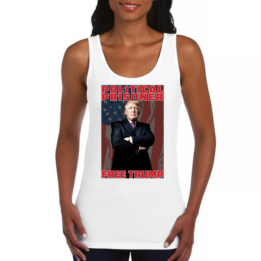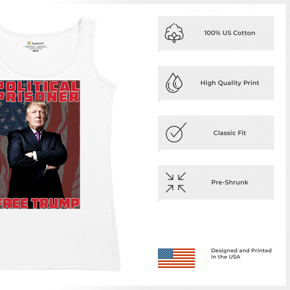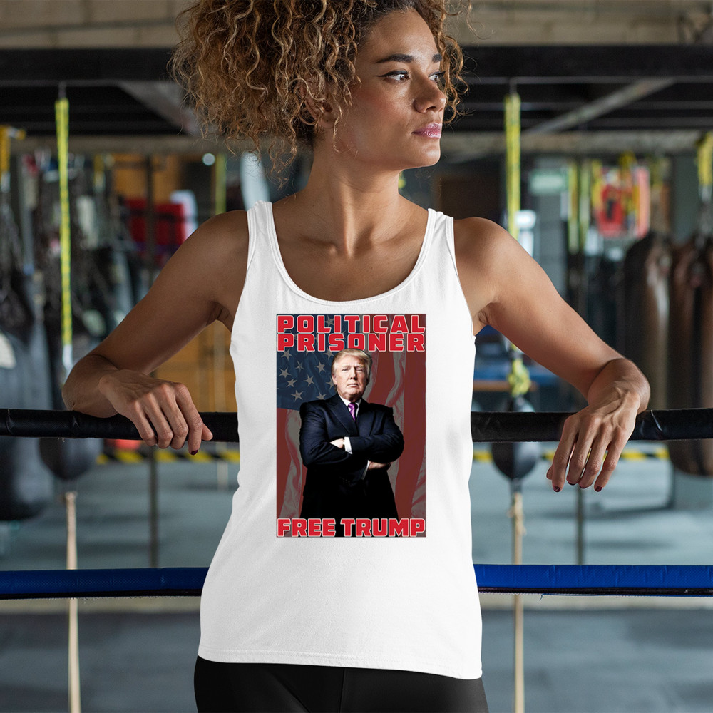 Show your support with the "Political Prisoner Free Trump" design, featuring Trump against an American flag. Perfect for conservative patriots and Trump supporters.