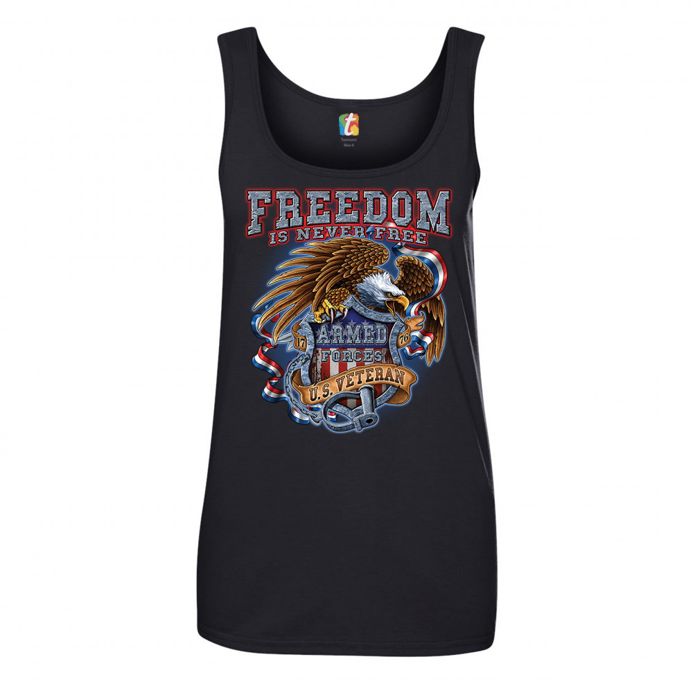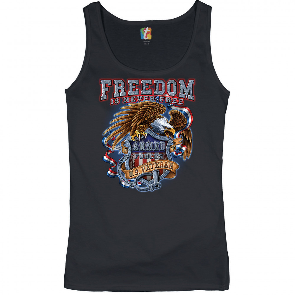 A patriotic print featuring a bald eagle holding a shield with an American Flag and "Armed Forces" written on it. The print says: "Freedom Is Never Free, 1776, U.S. Veteran". Great choice to wear on Independence Day or any other patriotic holiday.