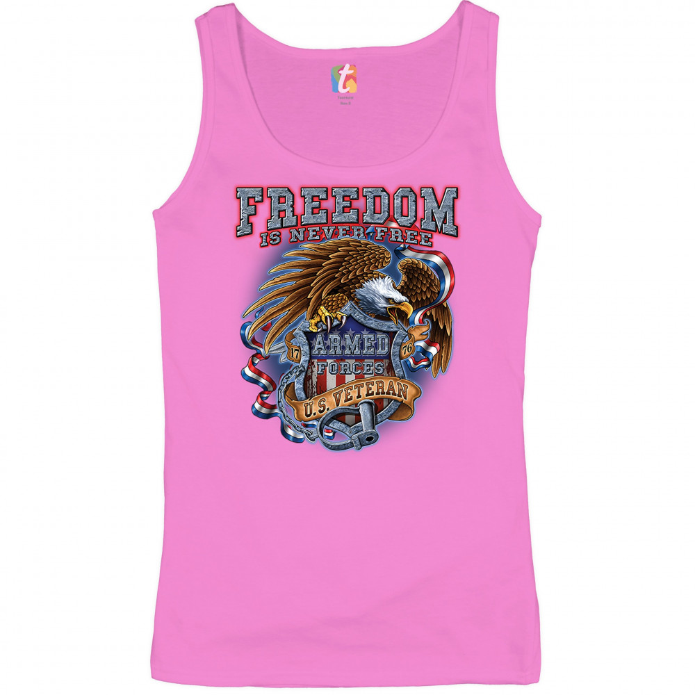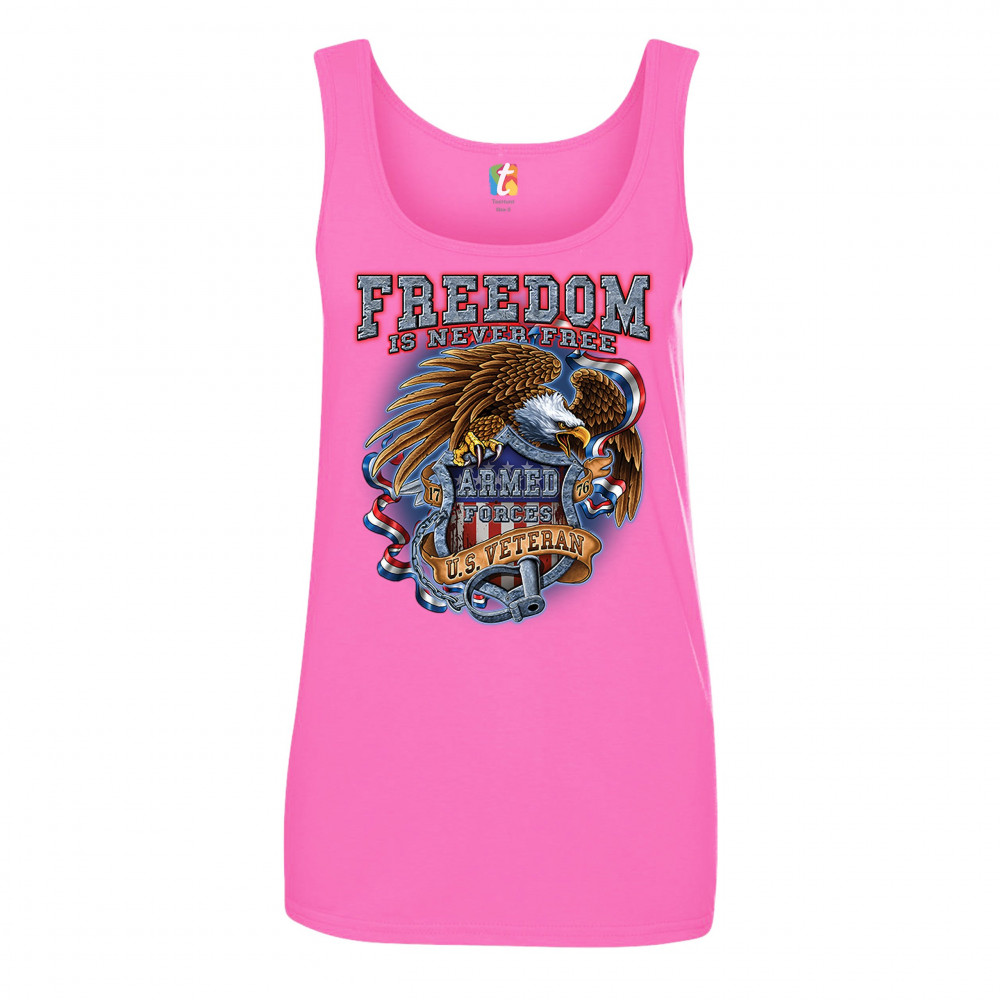 A patriotic print featuring a bald eagle holding a shield with an American Flag and "Armed Forces" written on it. The print says: "Freedom Is Never Free, 1776, U.S. Veteran". Great choice to wear on Independence Day or any other patriotic holiday.