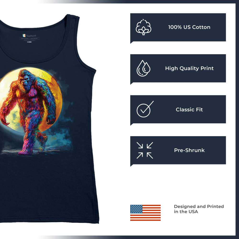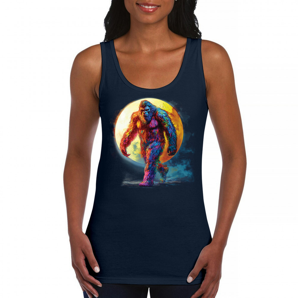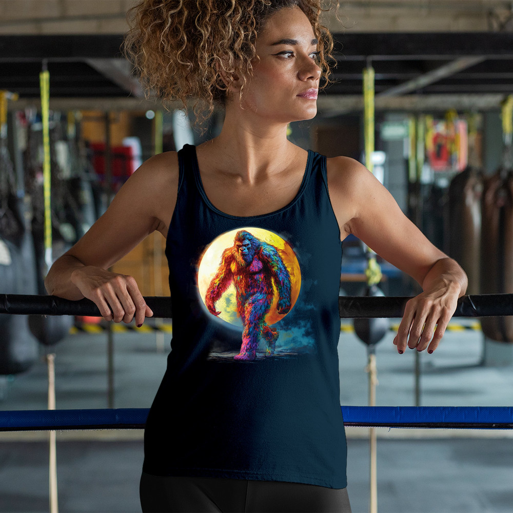 Rainbow Bigfoot under full moon design for cryptid lovers, festival goers, and psychedelic art fans. Bold, surreal, and eye-catching.