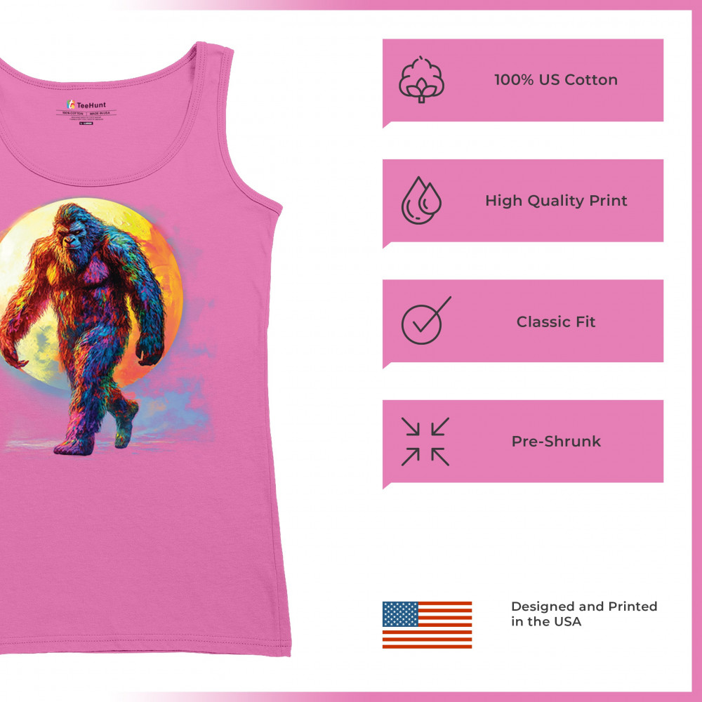 Rainbow Bigfoot under full moon design for cryptid lovers, festival goers, and psychedelic art fans. Bold, surreal, and eye-catching.