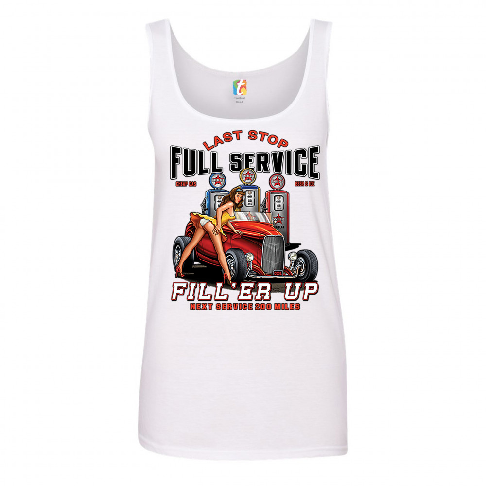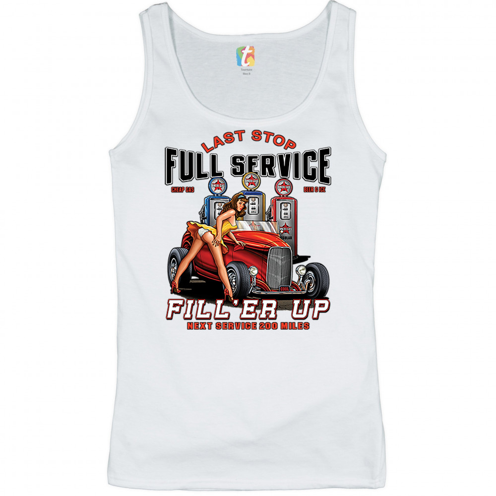 A print featuring a hot pin-up girl leaning on a convertible coupe hot rod with a registration plate saying "cool". In the background there are several gas stations. The print says: "Last Stop, Full Service, Cheap Gas, Beer & Ice, Fill 'Er Up, Next Servic