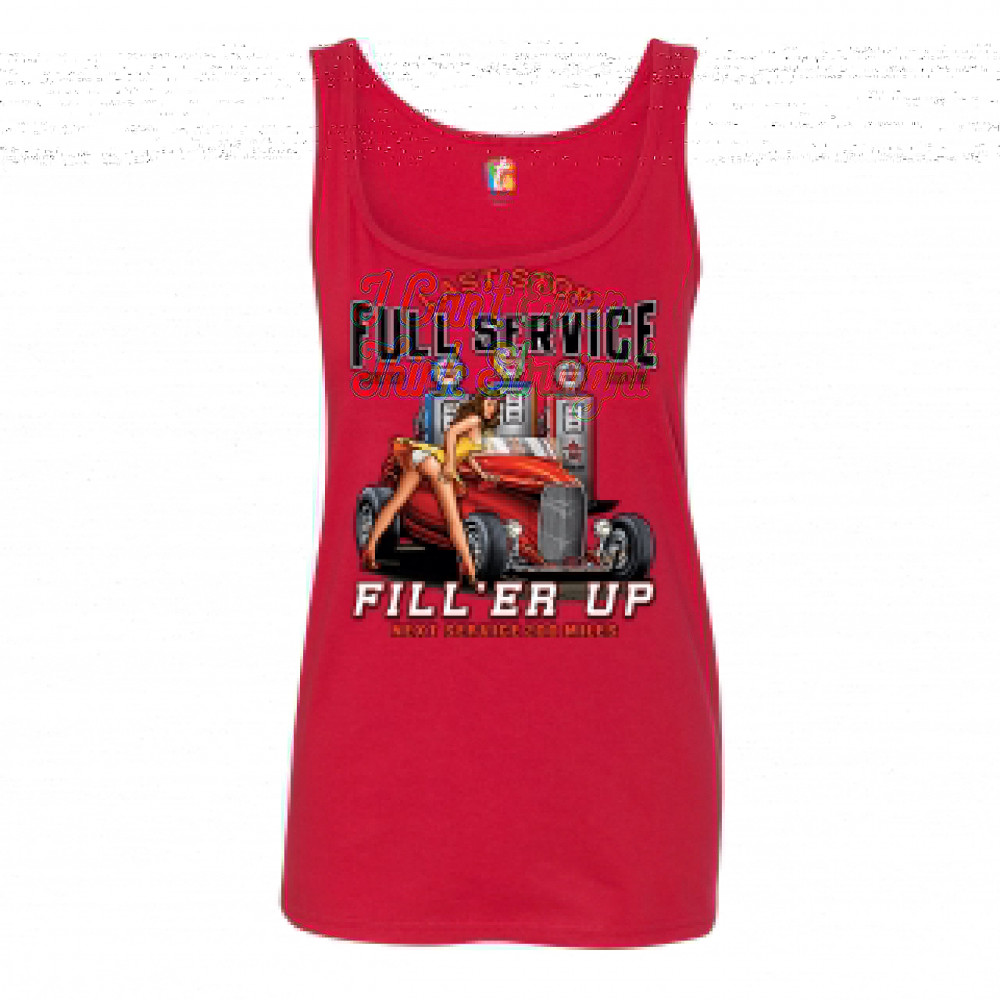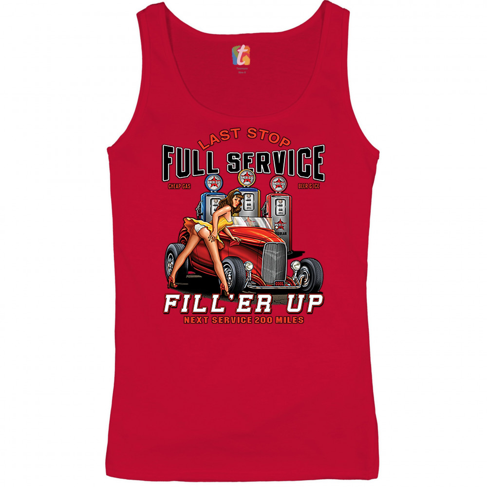 A print featuring a hot pin-up girl leaning on a convertible coupe hot rod with a registration plate saying "cool". In the background there are several gas stations. The print says: "Last Stop, Full Service, Cheap Gas, Beer & Ice, Fill 'Er Up, Next Servic