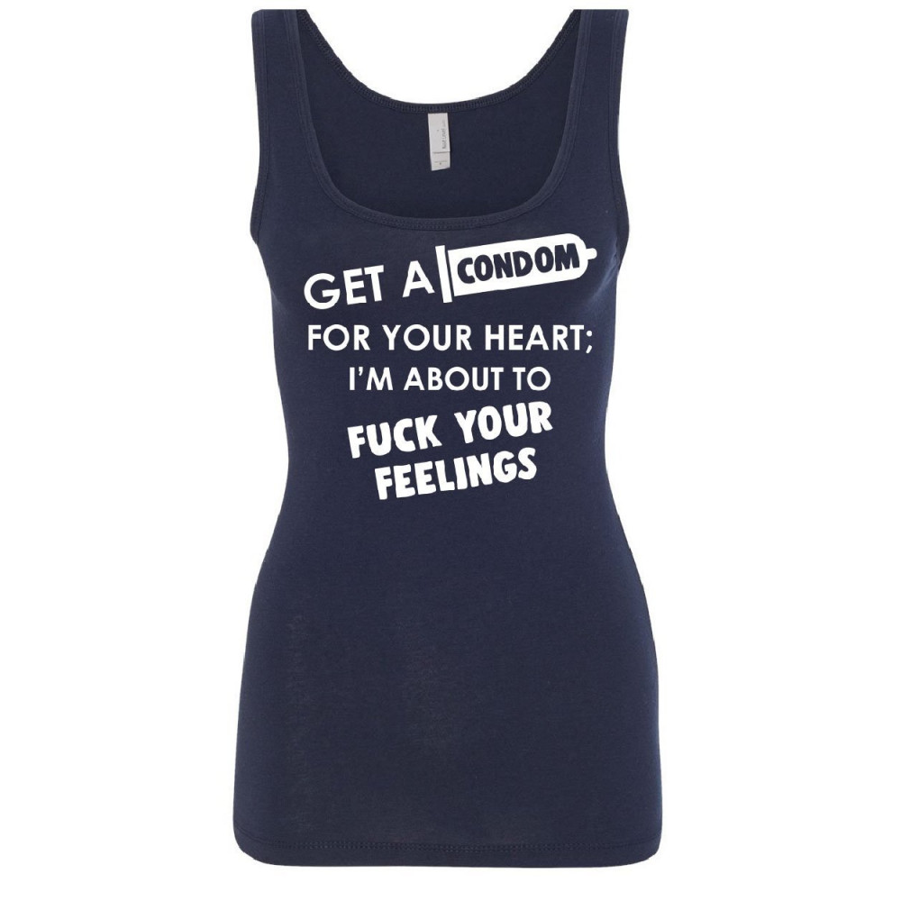 GET A CONDOM FOR YOUR HEART women's tank top funny rude offensive humor top navy blue