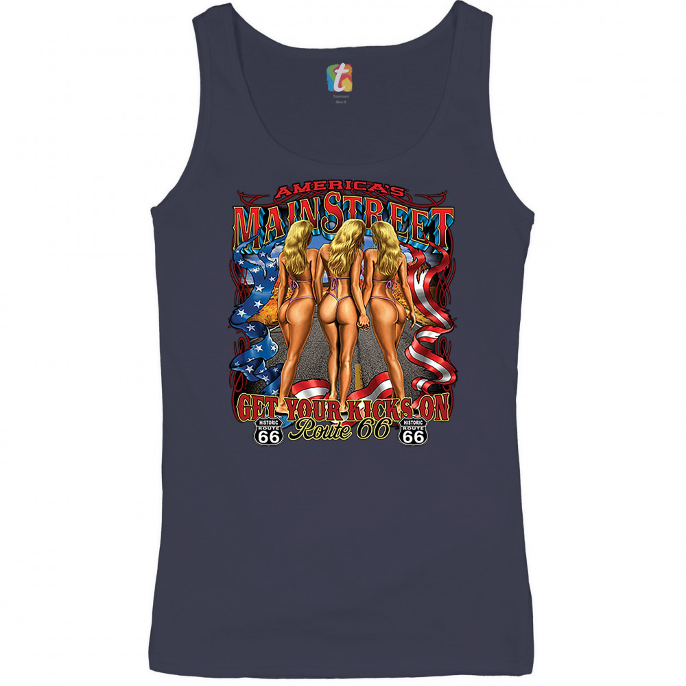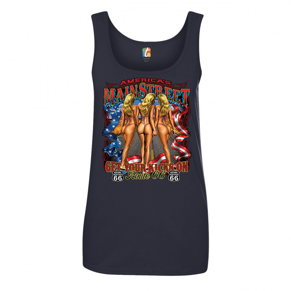 A print featuring three scantily-clad blondes holding each other's hands walking on a highway. The print says: "America's Main Street, Get Your Kicks on Route 66" and also features a ribbon with stars and stripes on it and two "Historic Route 66" signs. A