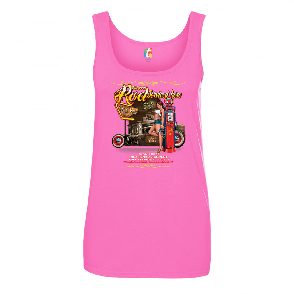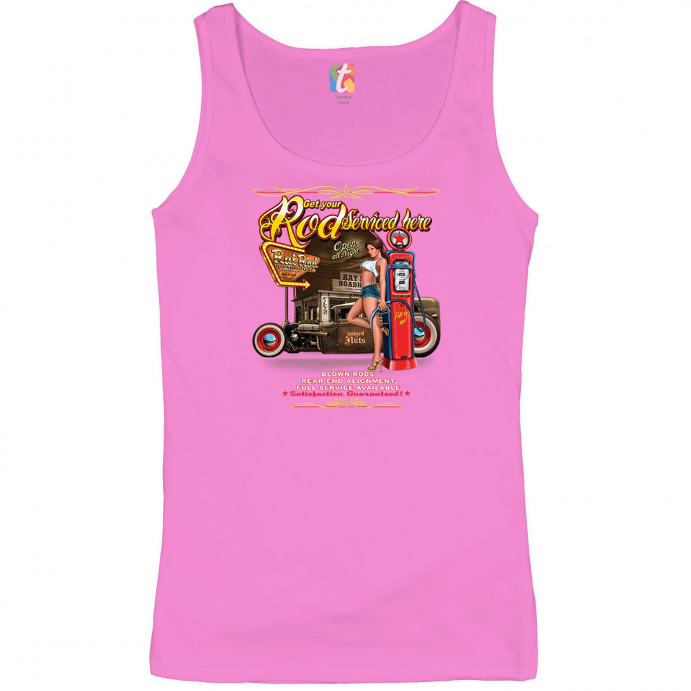 A print featuring a sexy pin-up girl leaning on a gas pump. There is a hot rod behind her and a "Rat Rod Roudhouse" in the background. The print also includes a bunch of innuendos: "get your rod serviced here, blown rods, rear end alignment, full service