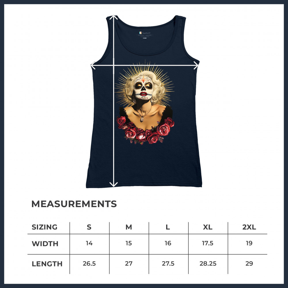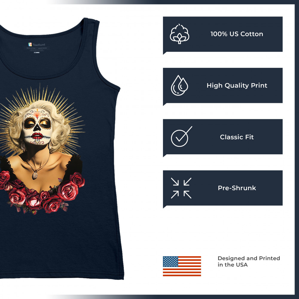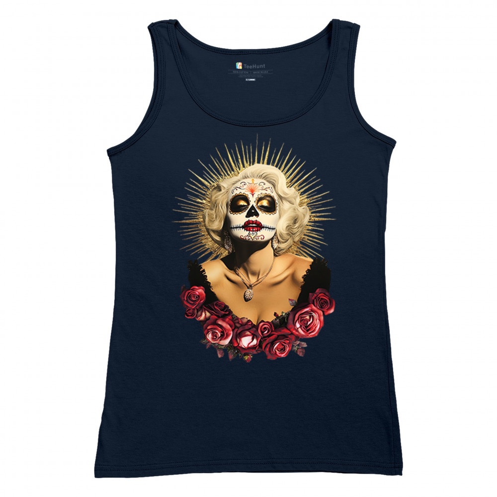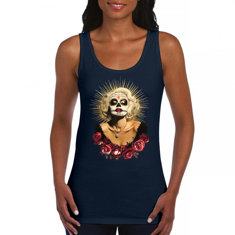This bold and beautiful sugar skull design features a glamorous calavera woman crowned in a golden halo and framed by roses. A divine tribute to Dia de los Muertos, this look blends vintage glam, Latin culture, makeup artistry, and sacred symbolism. Perfect for fans of gothic beauty, Halloween, and heritage expression.