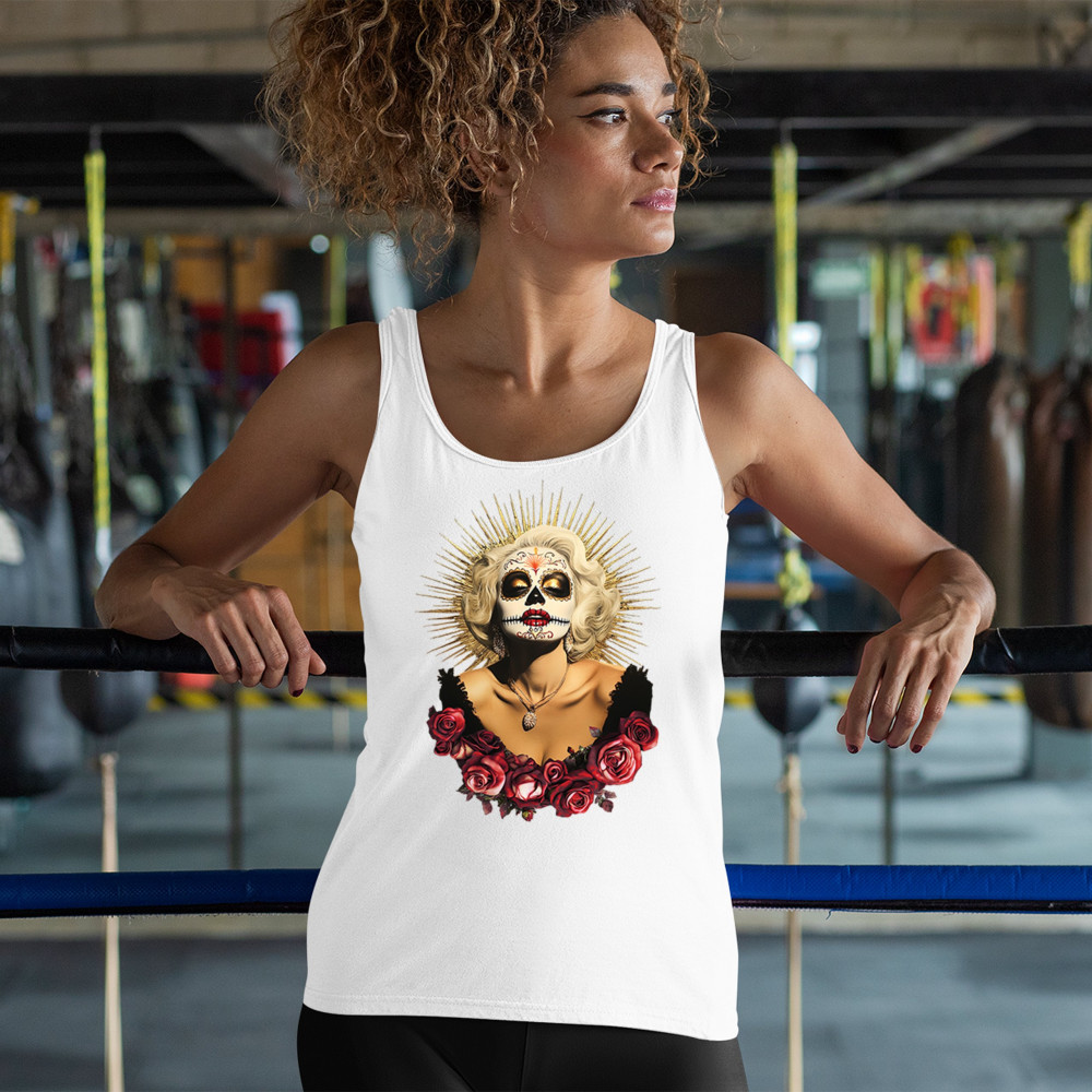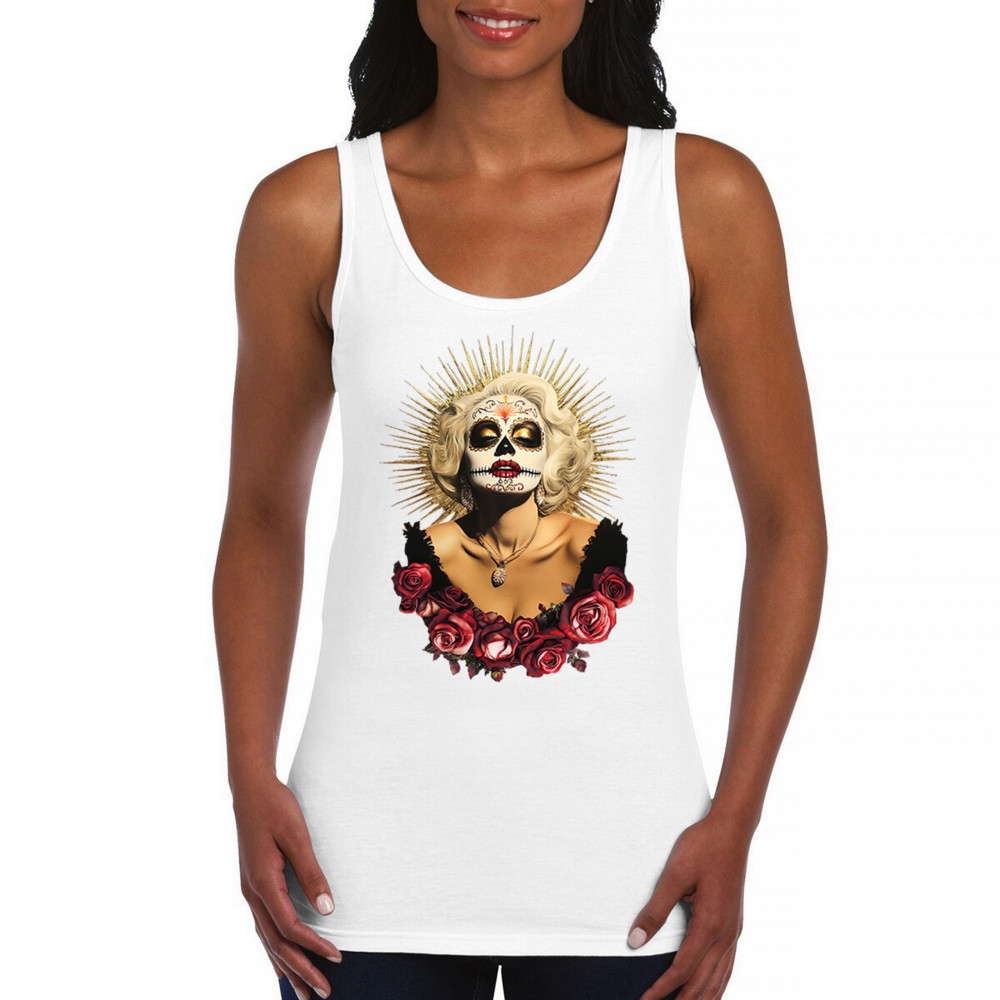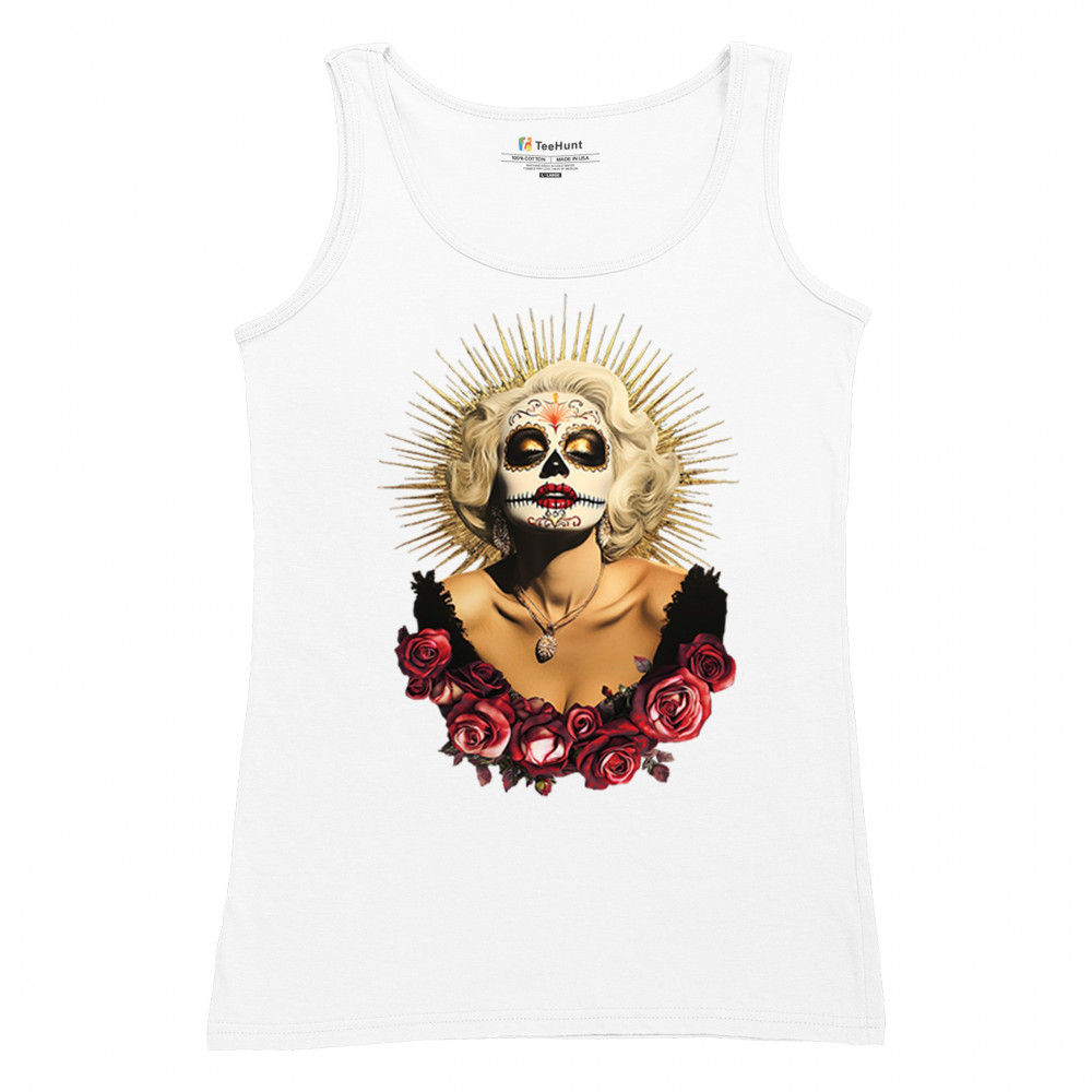 This bold and beautiful sugar skull design features a glamorous calavera woman crowned in a golden halo and framed by roses. A divine tribute to Dia de los Muertos, this look blends vintage glam, Latin culture, makeup artistry, and sacred symbolism. Perfect for fans of gothic beauty, Halloween, and heritage expression.