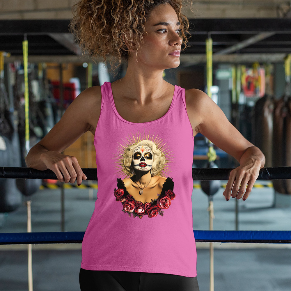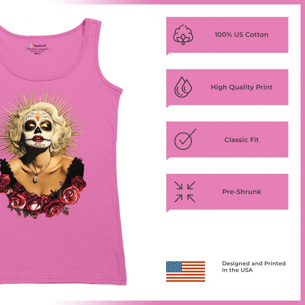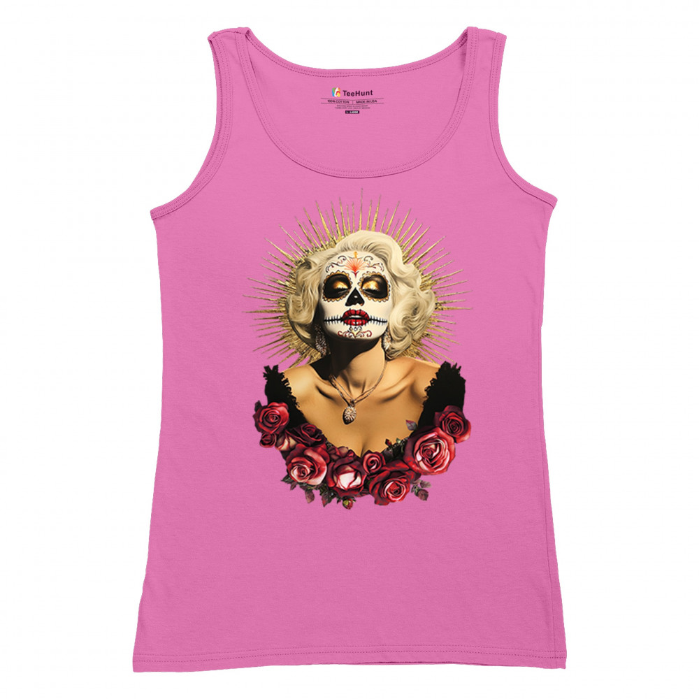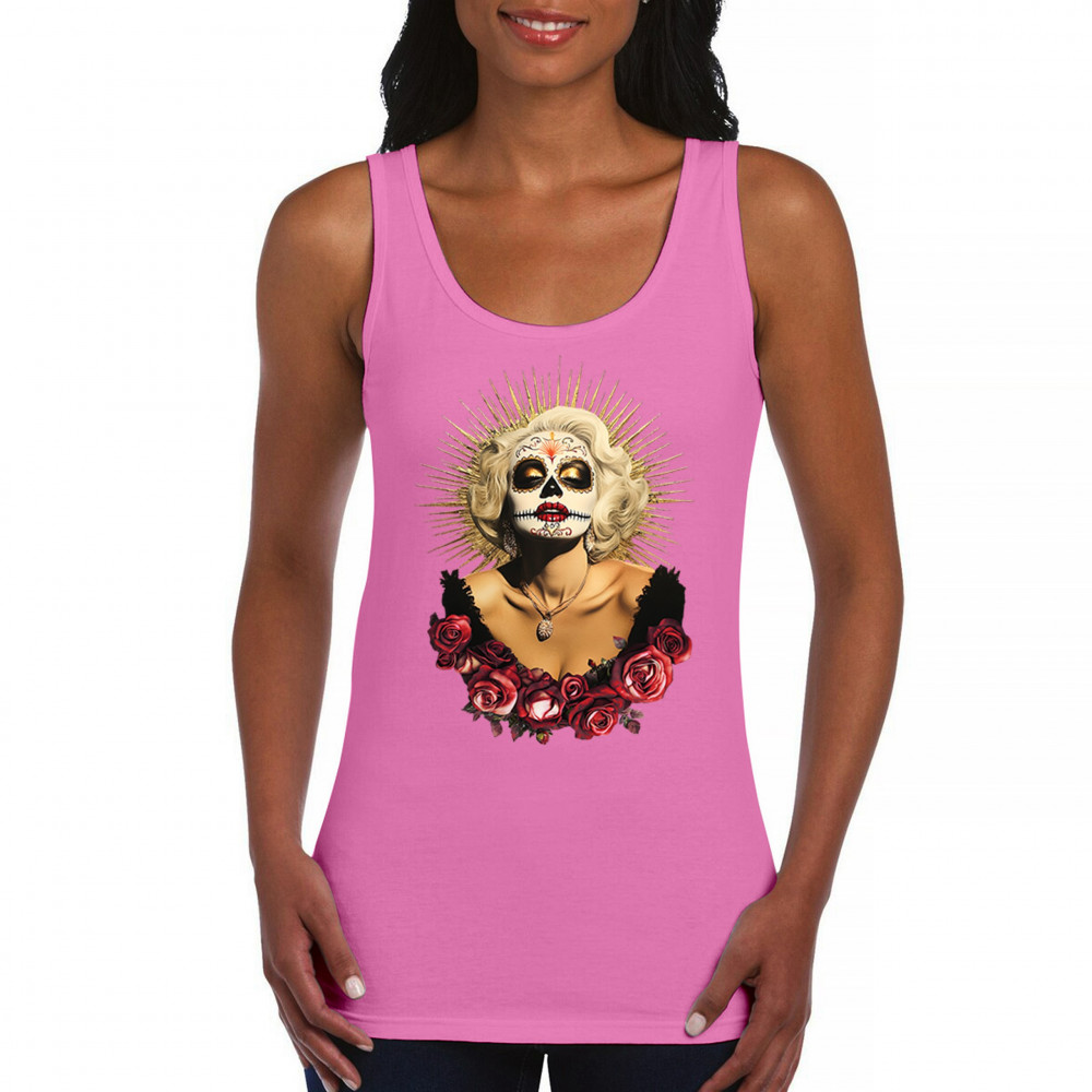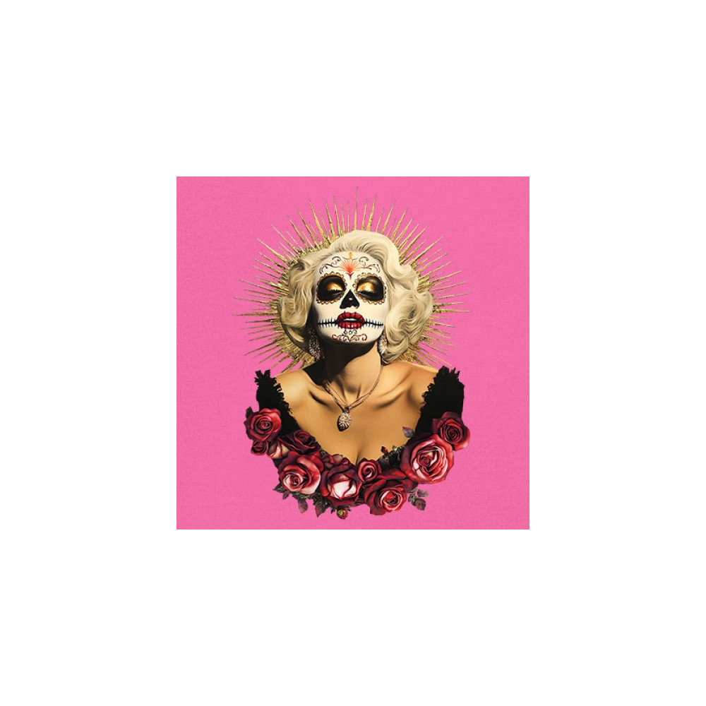 This bold and beautiful sugar skull design features a glamorous calavera woman crowned in a golden halo and framed by roses. A divine tribute to Dia de los Muertos, this look blends vintage glam, Latin culture, makeup artistry, and sacred symbolism. Perfect for fans of gothic beauty, Halloween, and heritage expression.