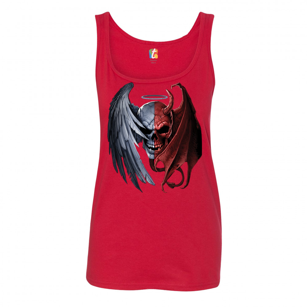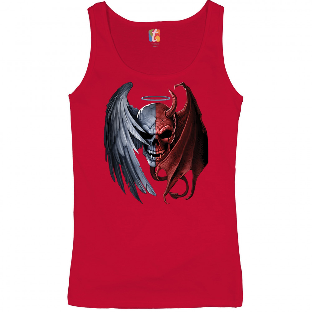 A print featuring a skull face, one half of which is light and has an angel's wing covering it and the other is dark with a horn sticking out of the forehead and a demon's wing. Below the skull you can see a demon's tail and a halo above it. A great