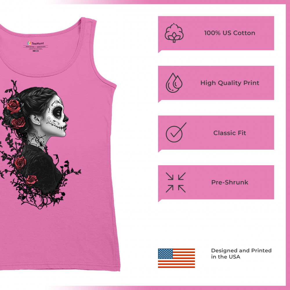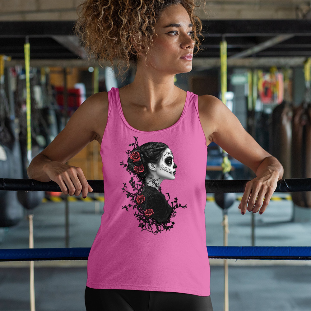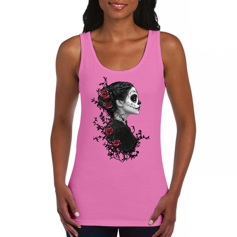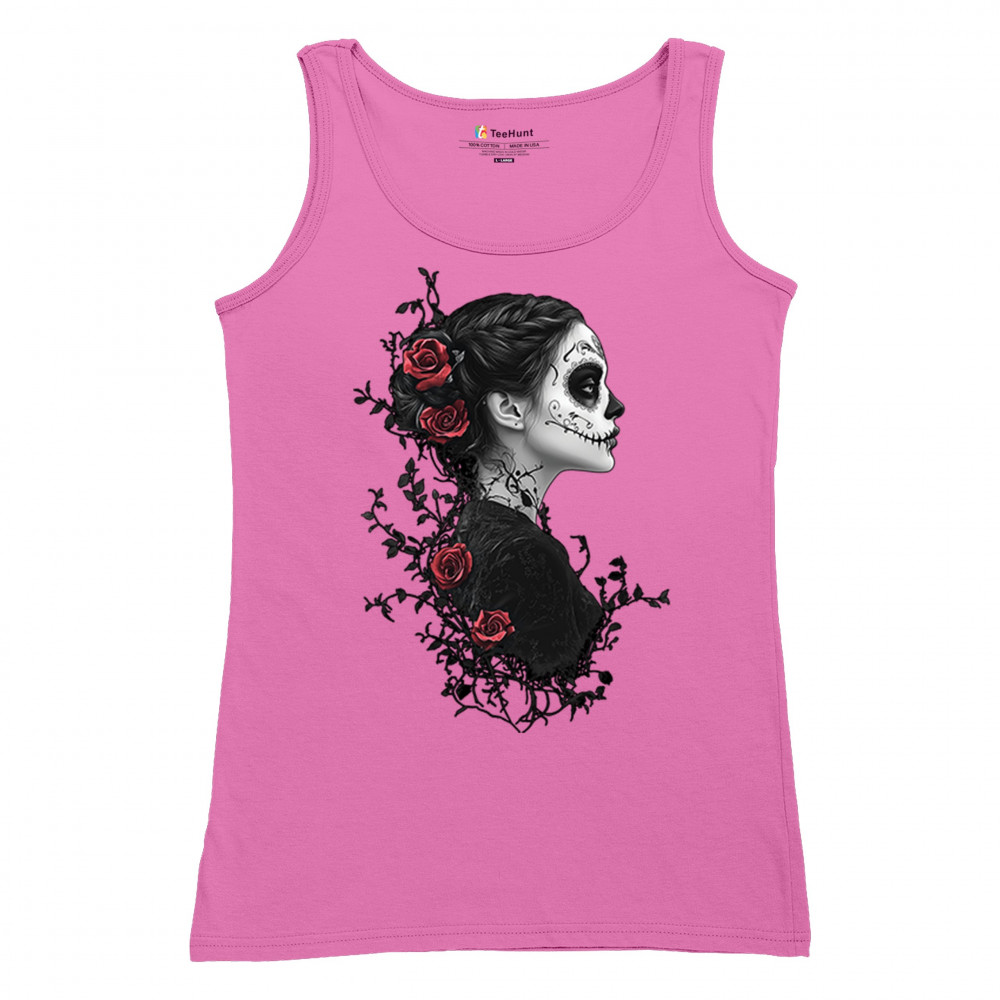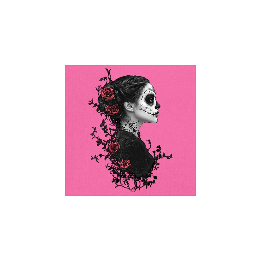Celebrate Dia de los Muertos in style with this refined sugar skull woman design. Featuring a side profile view, vibrant red roses, and dark gothic floral elements, it creates a graceful balance between mystery and beauty. Ideal for fans of macabre art, skull themes, and honoring ancestral traditions through elegant visuals.