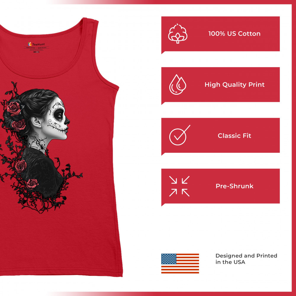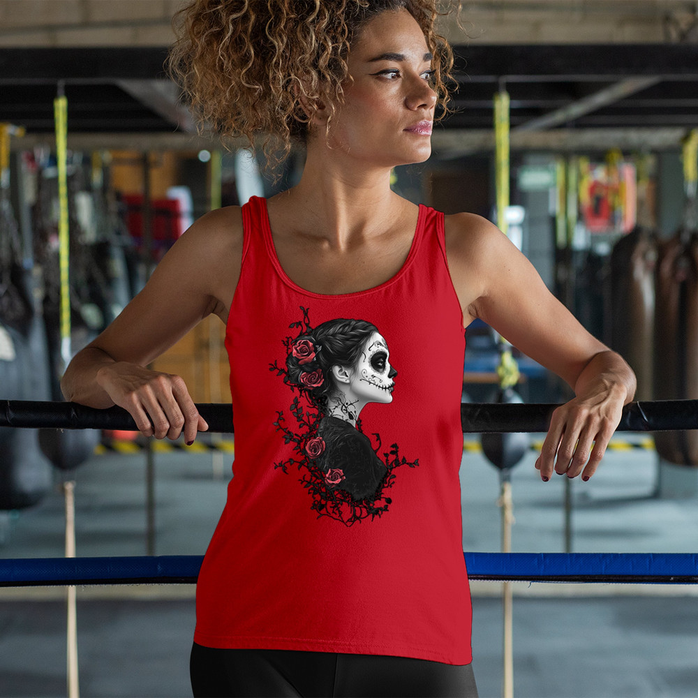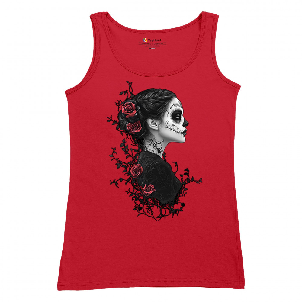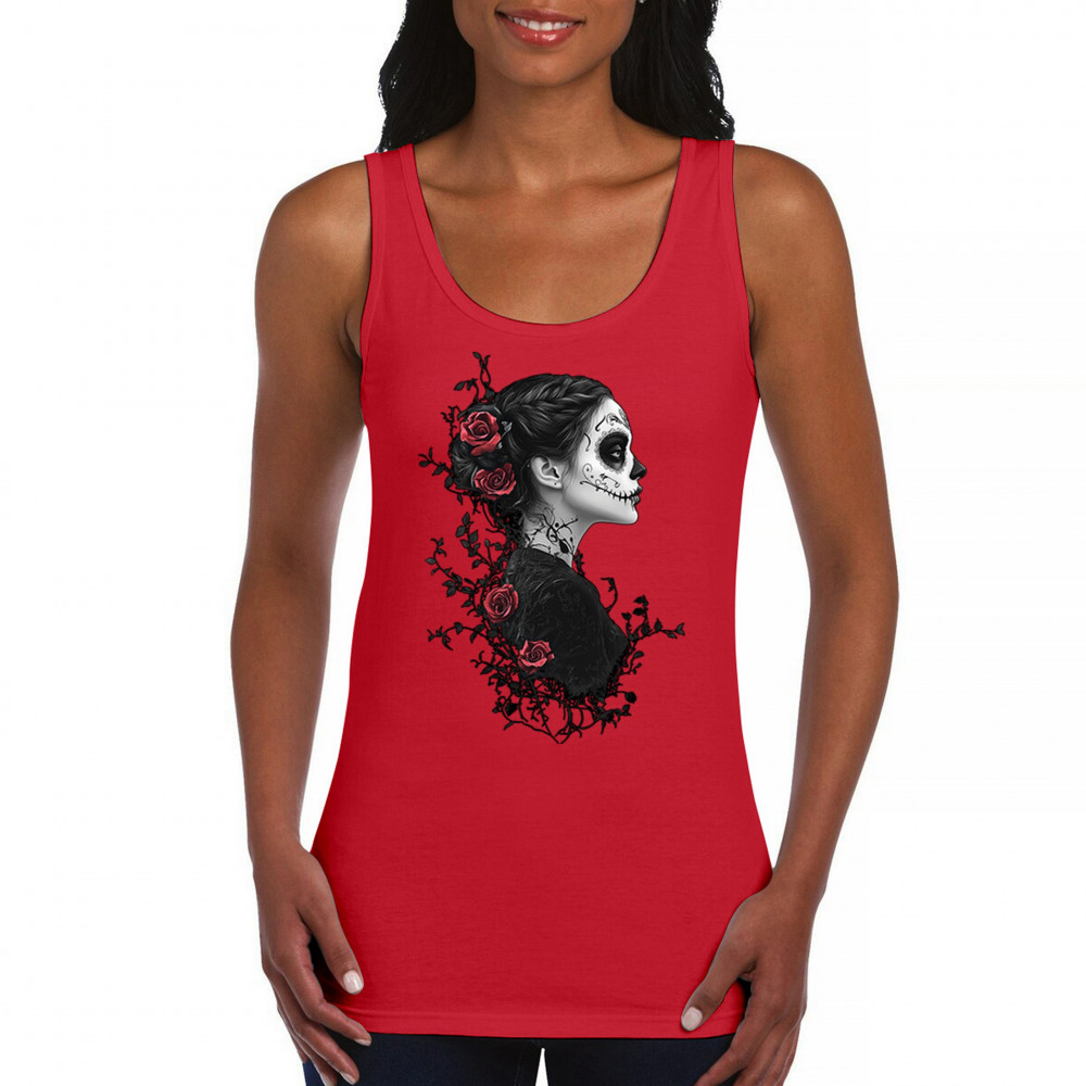 Celebrate Dia de los Muertos in style with this refined sugar skull woman design. Featuring a side profile view, vibrant red roses, and dark gothic floral elements, it creates a graceful balance between mystery and beauty. Ideal for fans of macabre art, skull themes, and honoring ancestral traditions through elegant visuals.