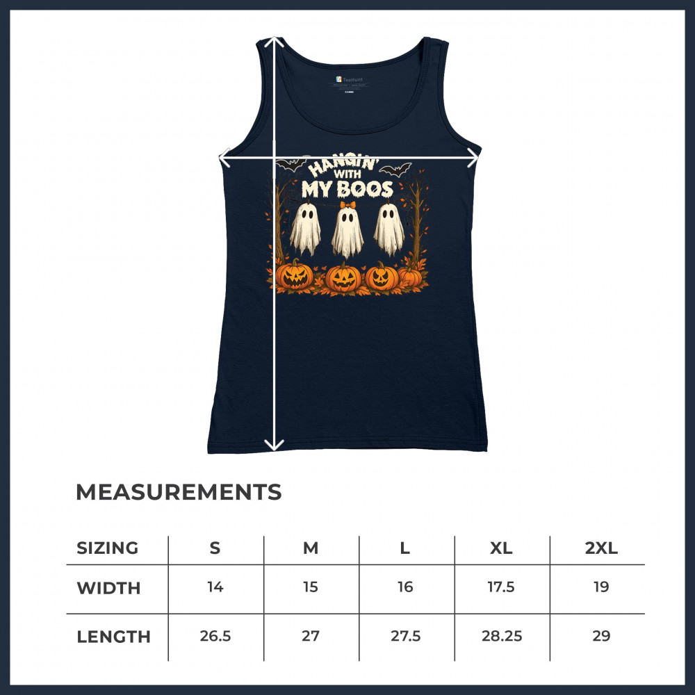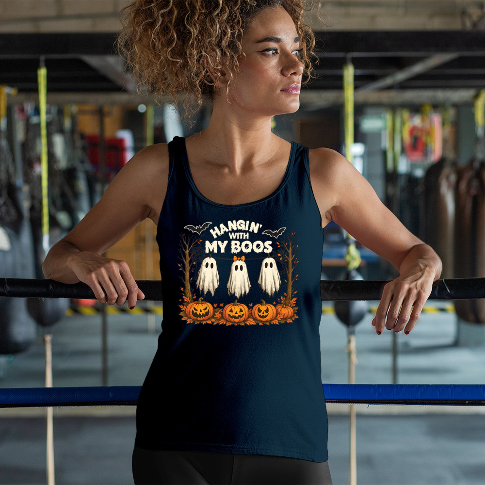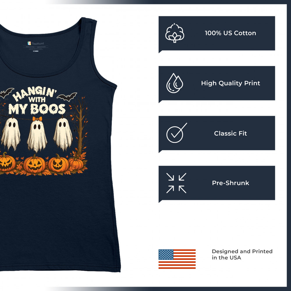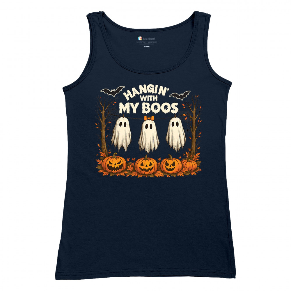 Hangin With My Boos design featuring spooky ghosts, jack o lanterns, and haunted house humor. Perfect for Halloween night, October 31, and parties.