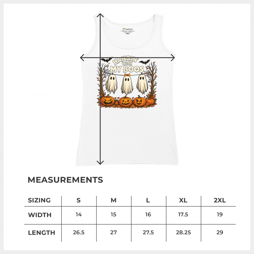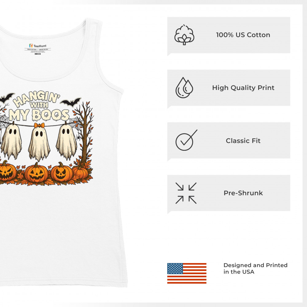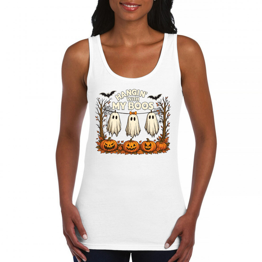 Hangin With My Boos design featuring spooky ghosts, jack o lanterns, and haunted house humor. Perfect for Halloween night, October 31, and parties.
