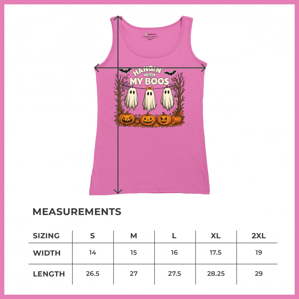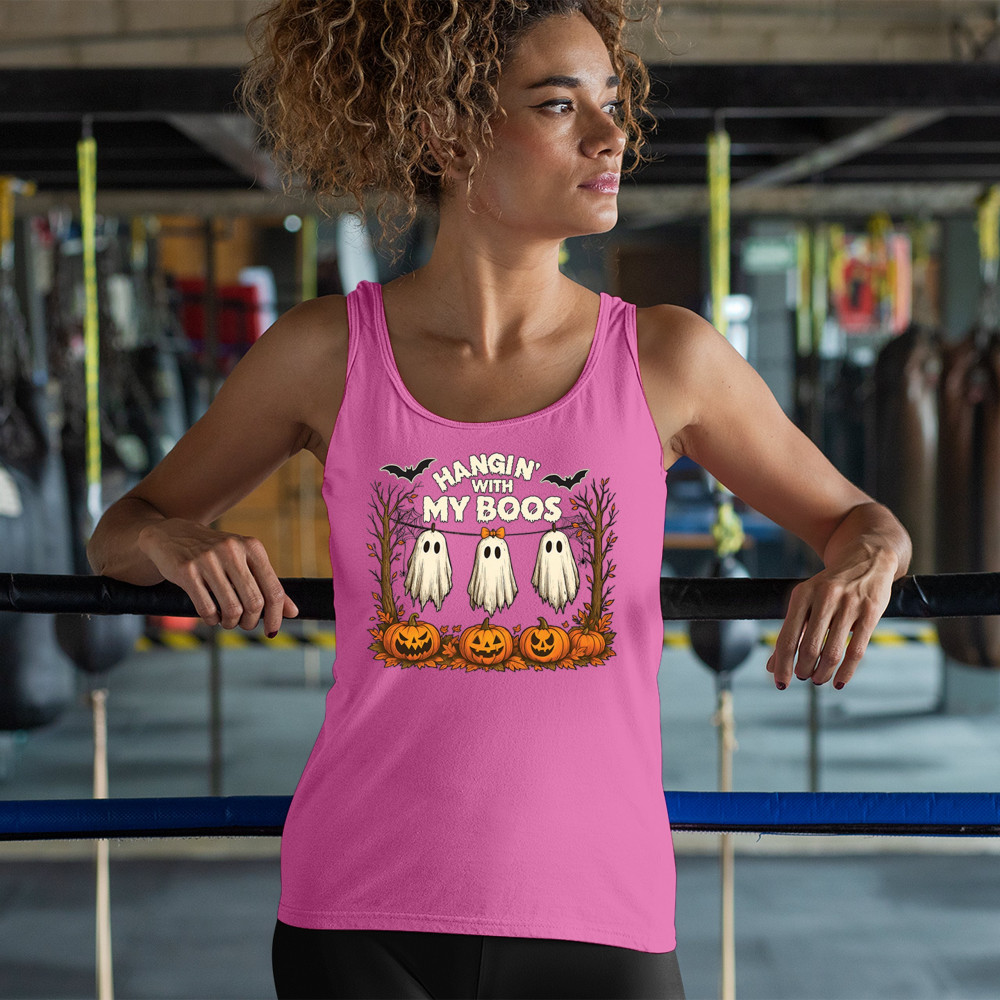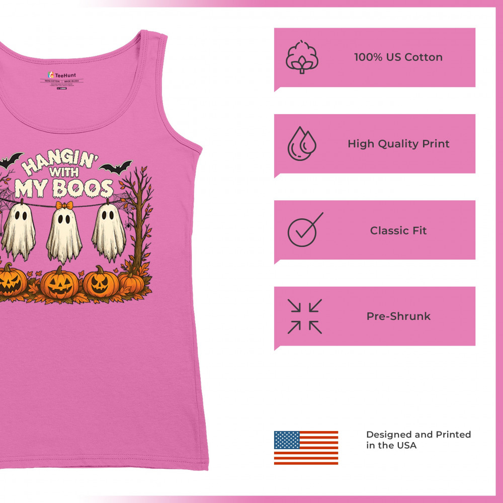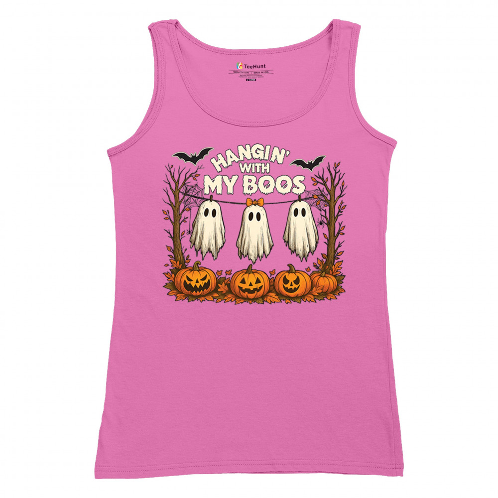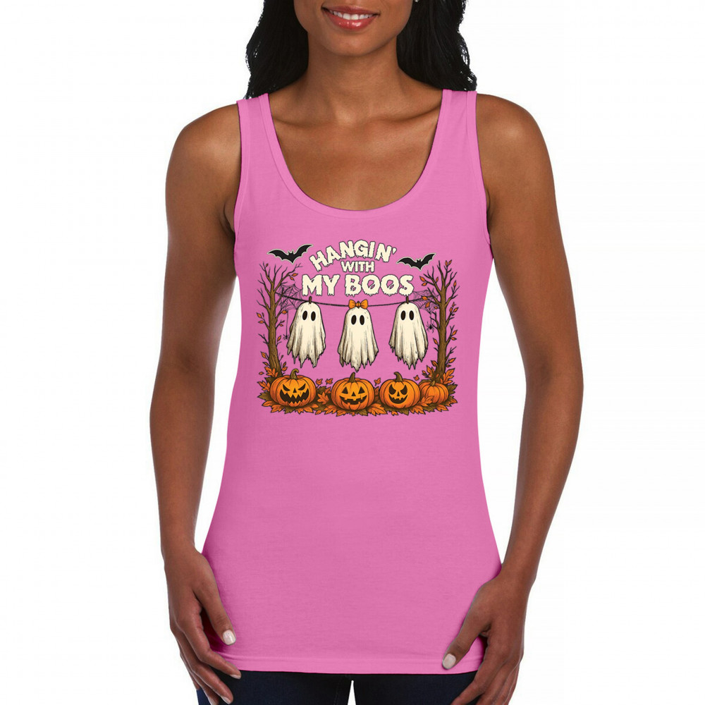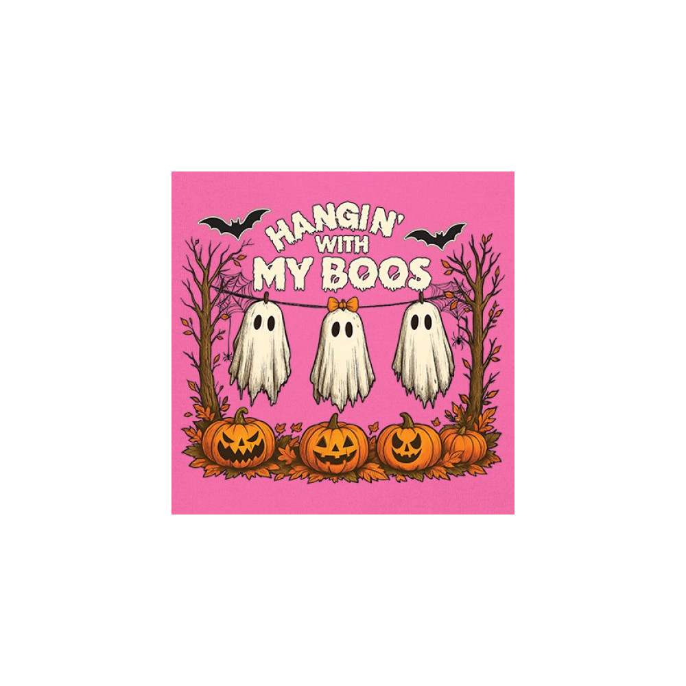 Hangin With My Boos design featuring spooky ghosts, jack o lanterns, and haunted house humor. Perfect for Halloween night, October 31, and parties.