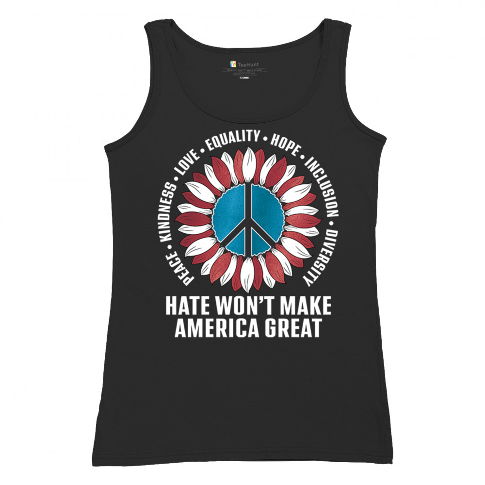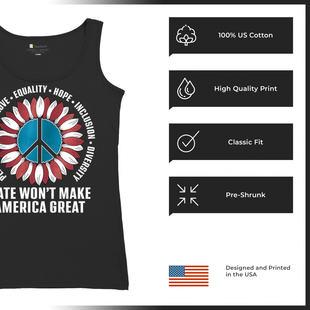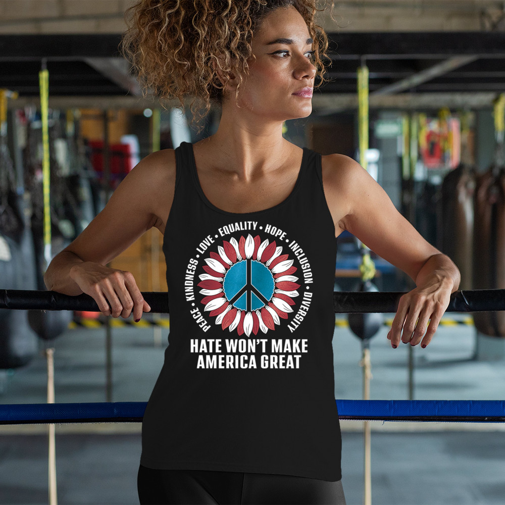 Embrace the message of love, equality, and unity with this eye-catching design. The sunflower and peace symbol represent a commitment to kindness and inclusion, rejecting hate and division. Perfect for those who support liberal values, this design is a bold statement against negativity and for a brighter future. Wear it proudly to show your belief in a diverse, united America. Let this design be a symbol of hope and progress for all.