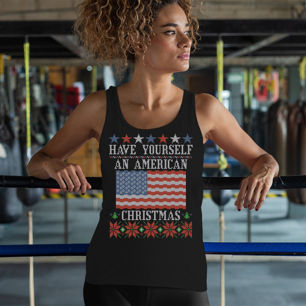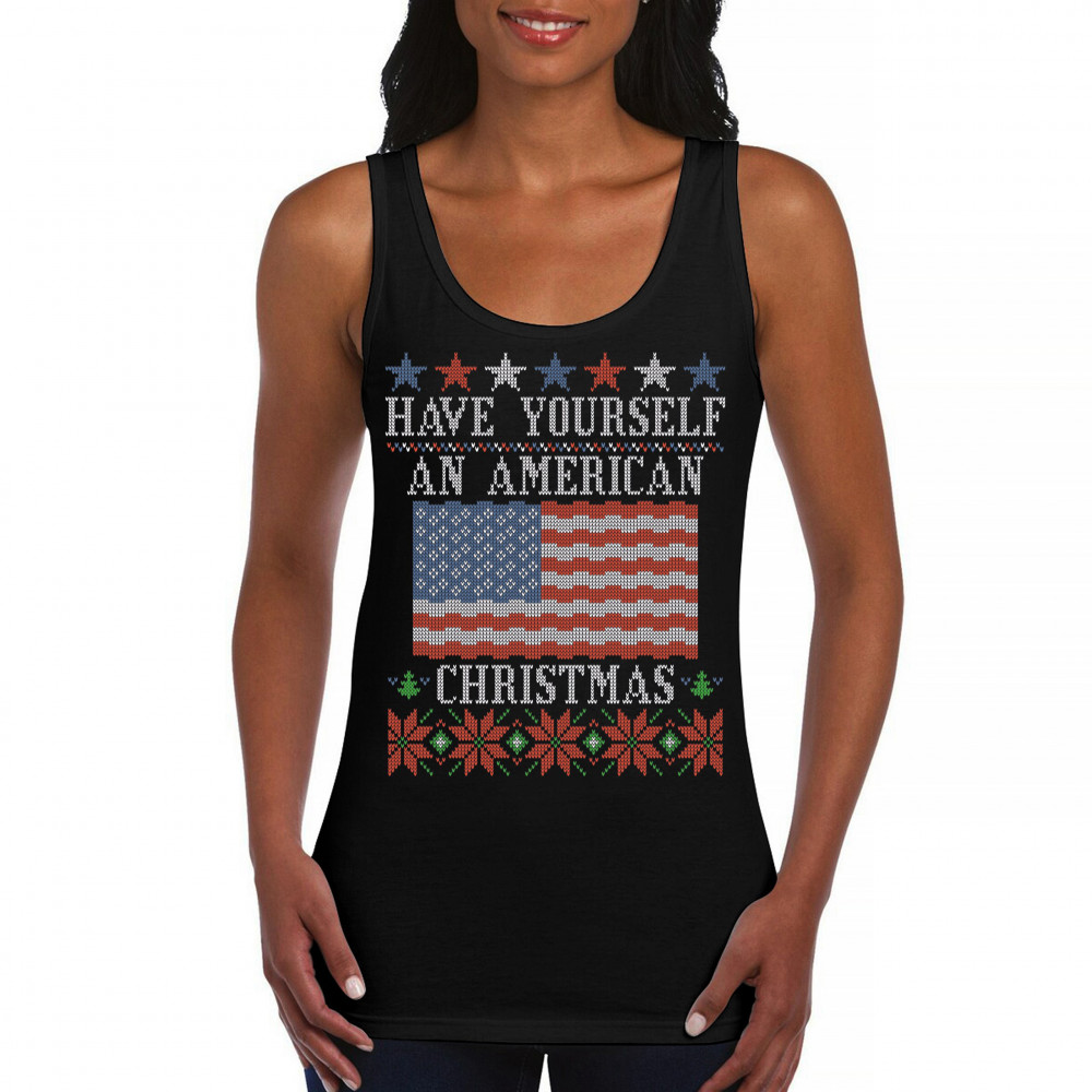 HAVE YOURSELF AN AMERICAN CHRISTMAS women's tank top ugly sweater patriotic black
