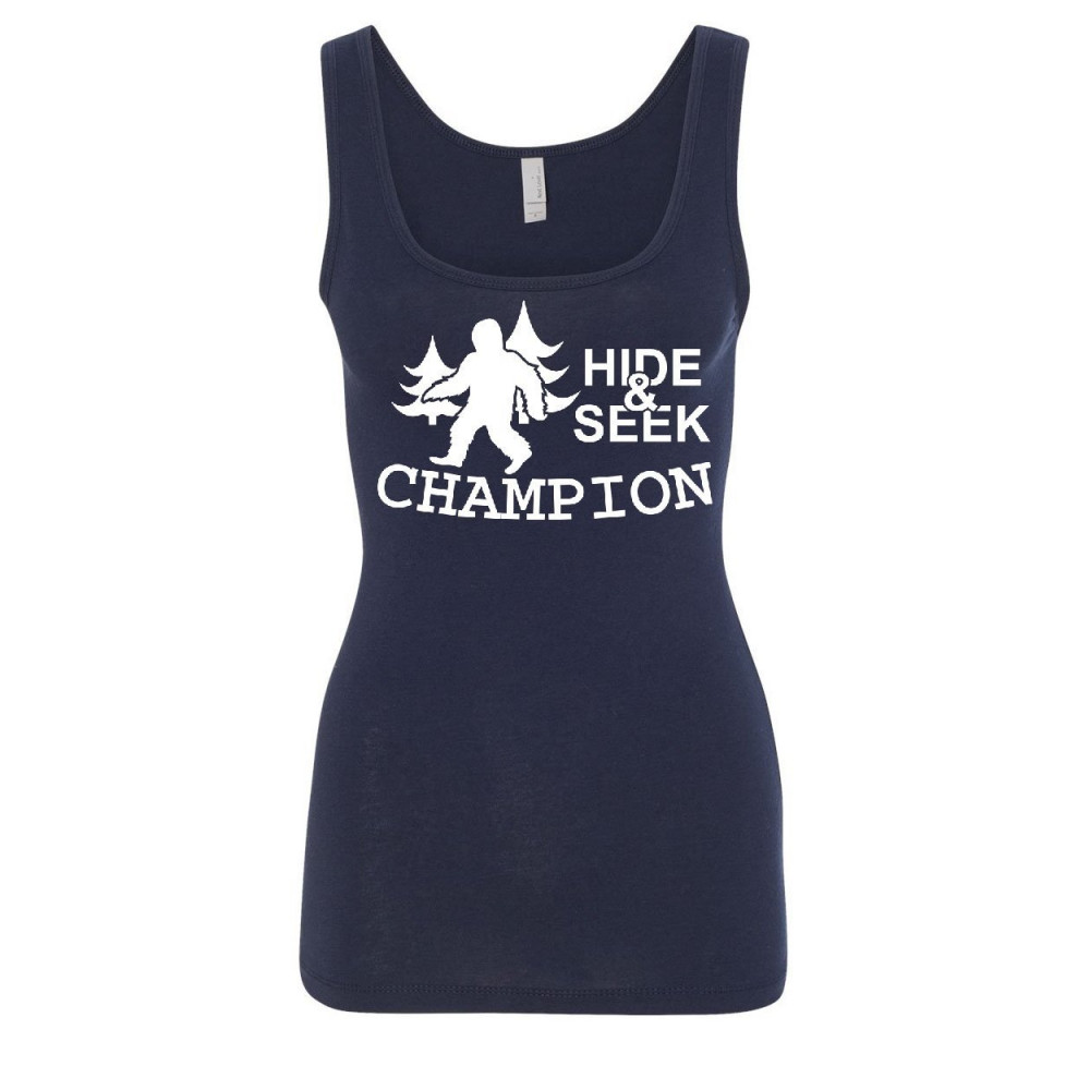 HIDE AND SEEK CHAMPION women's tank top bigfoot yeti funny humor top navy blue