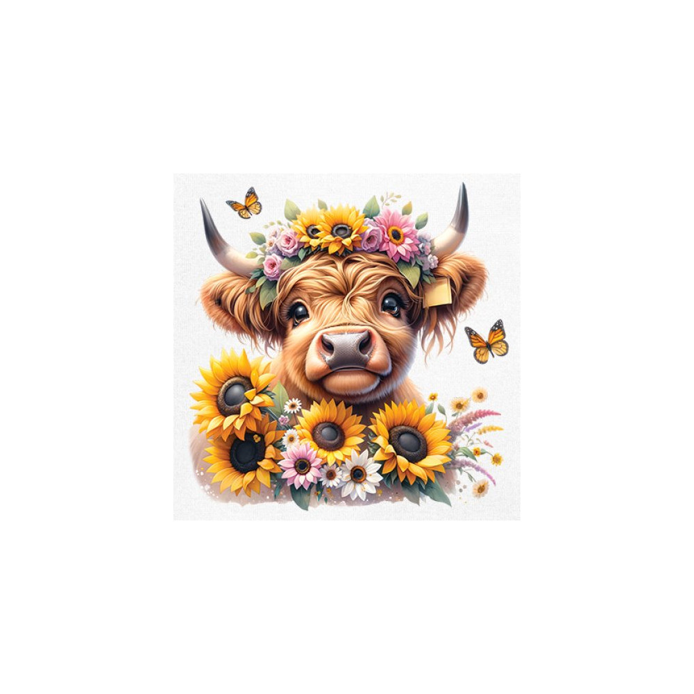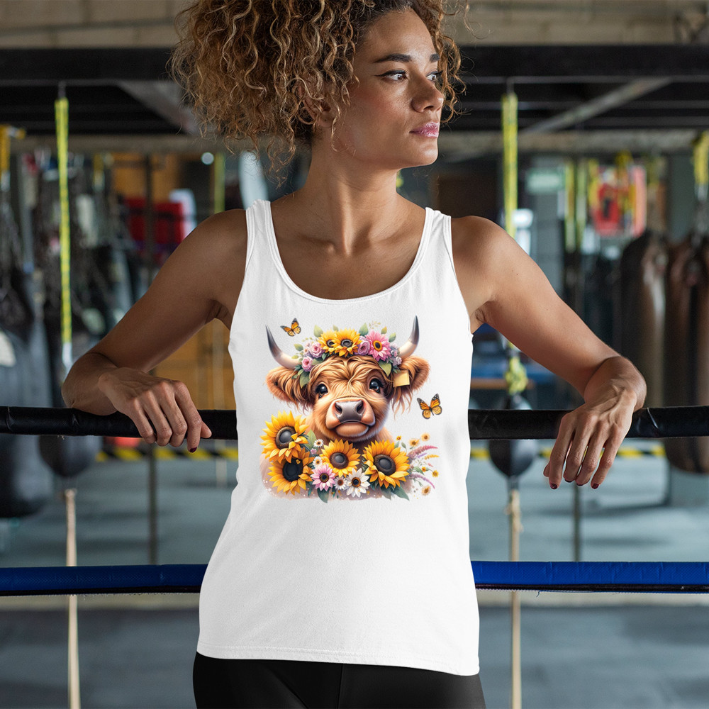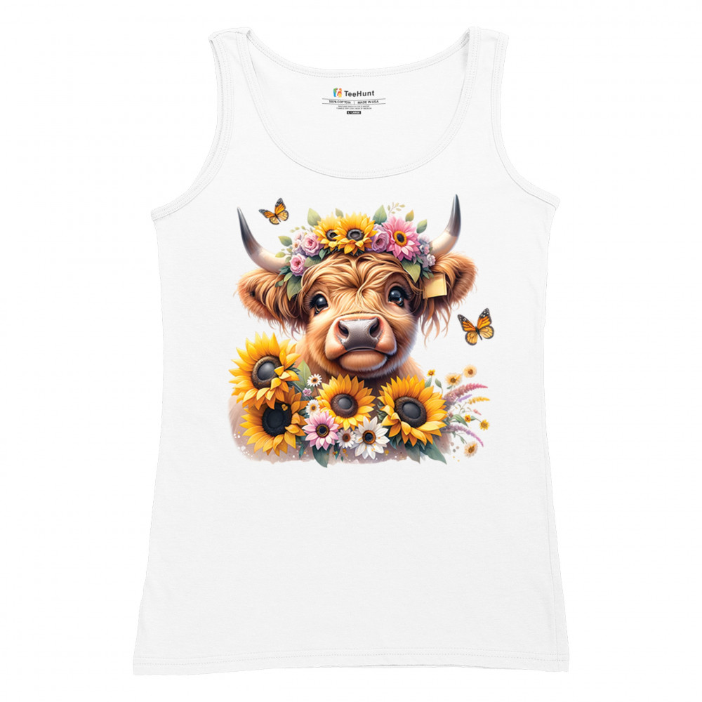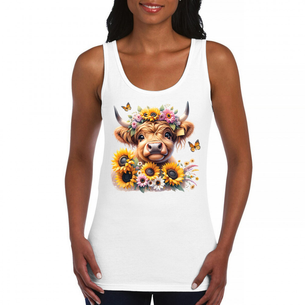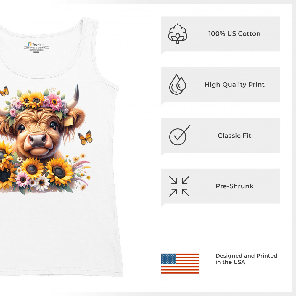 Highland Cow floral design with sunflowers and daisies, rustic farmhouse cow style, western ranch boho charm, and cozy country farmhouse shirt vibes.