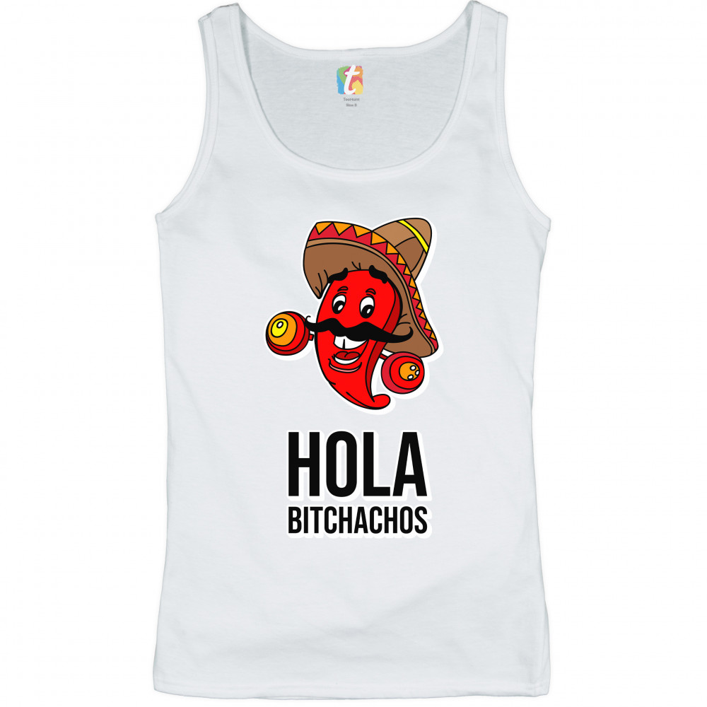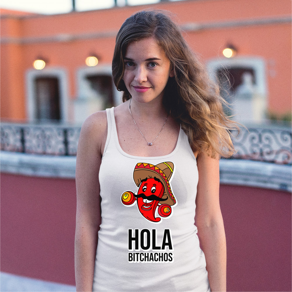 A funny print featuring a smiling red chili pepper with mustaches, wearing a sombrero and holding maracas. Underneath it says: "hola bitchachos". A great choice to give as a gift to your latino friends or family members to celebrate Cinco de Mayo.