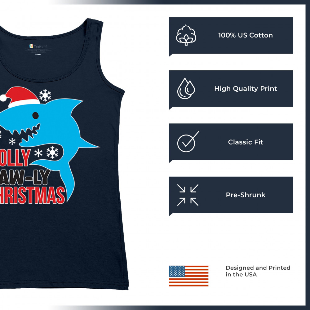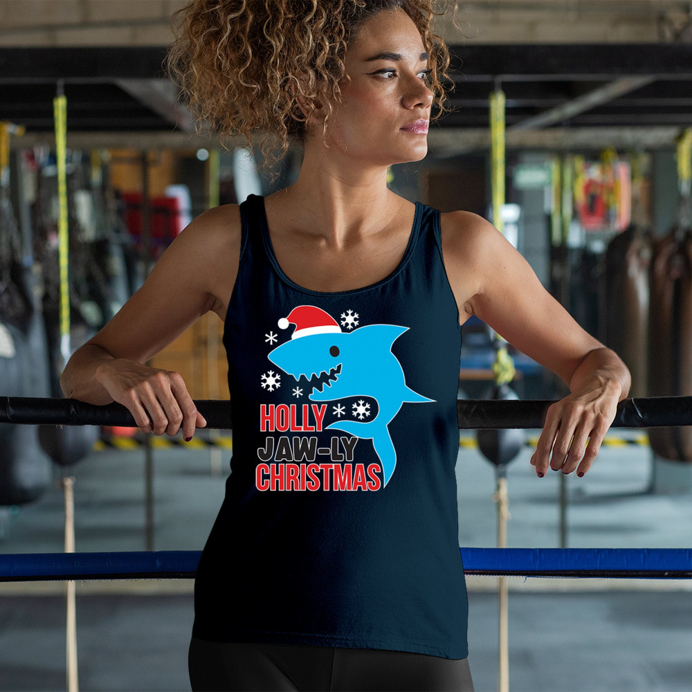Funny Holly Jaw-ly Christmas shark pun design with Santa hat and snowflakes. Perfect for ocean lovers, festive parties, and cheerful holiday fun.