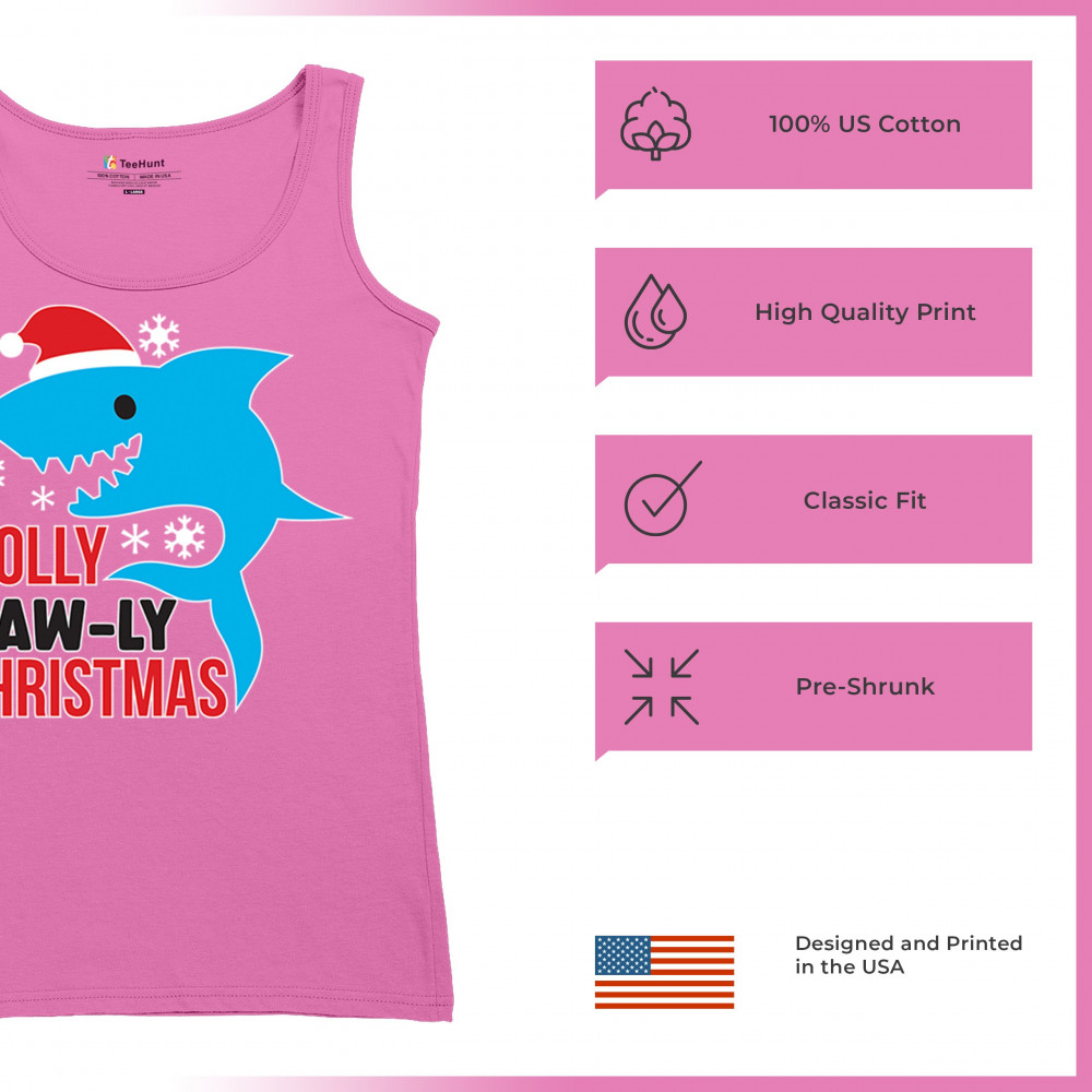 Funny Holly Jaw-ly Christmas shark pun design with Santa hat and snowflakes. Perfect for ocean lovers, festive parties, and cheerful holiday fun.