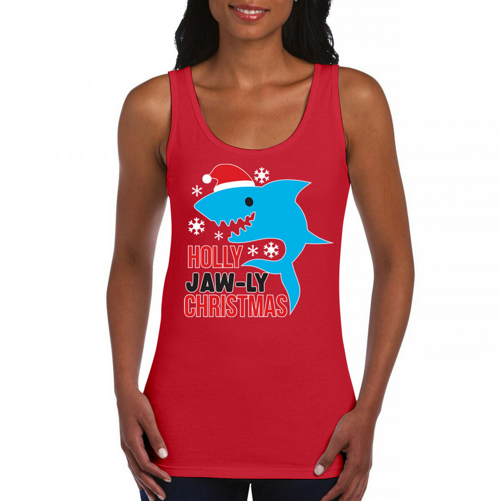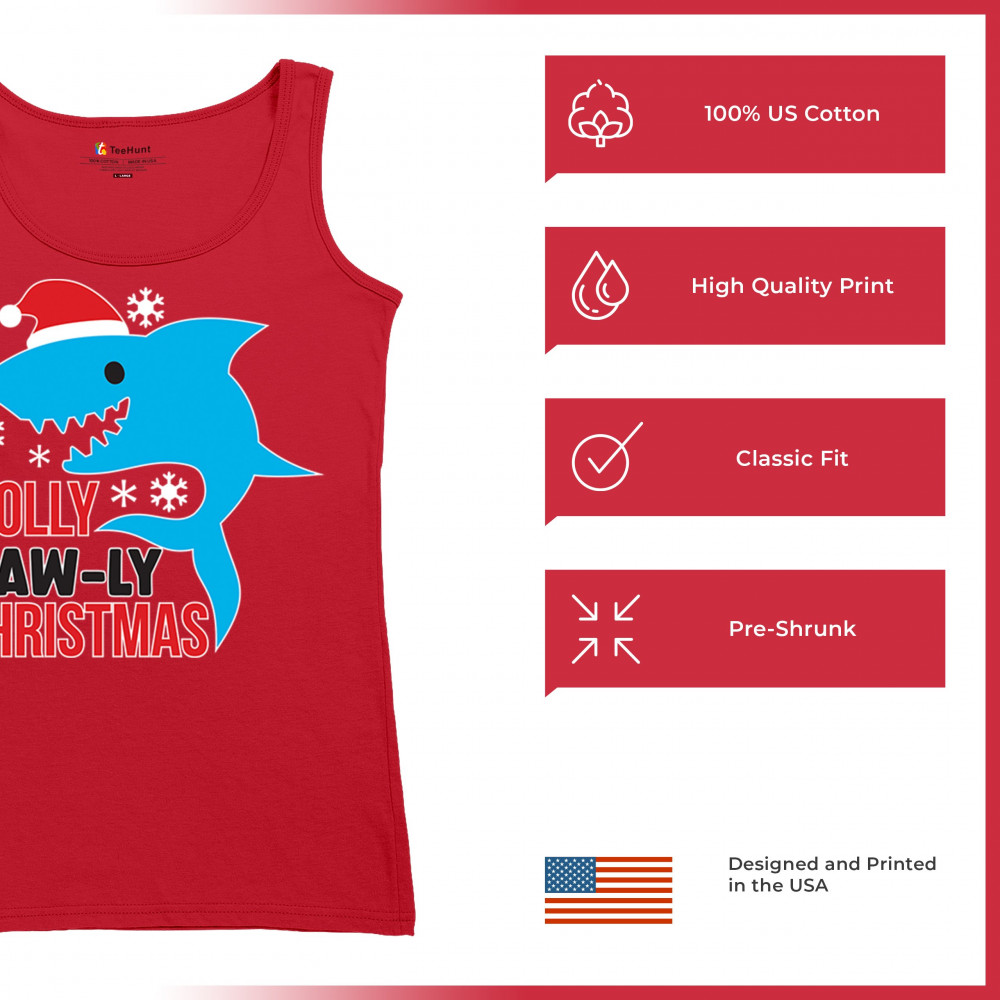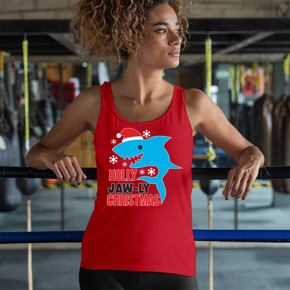 Funny Holly Jaw-ly Christmas shark pun design with Santa hat and snowflakes. Perfect for ocean lovers, festive parties, and cheerful holiday fun.