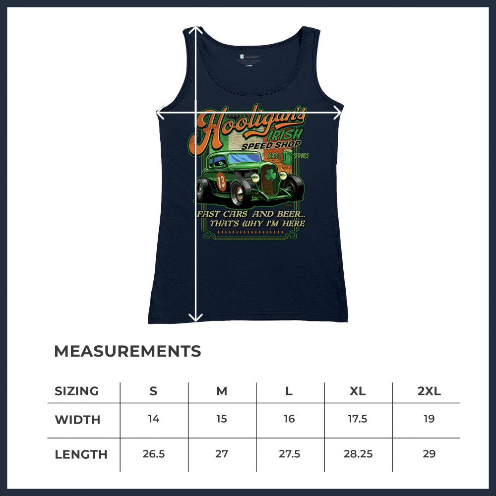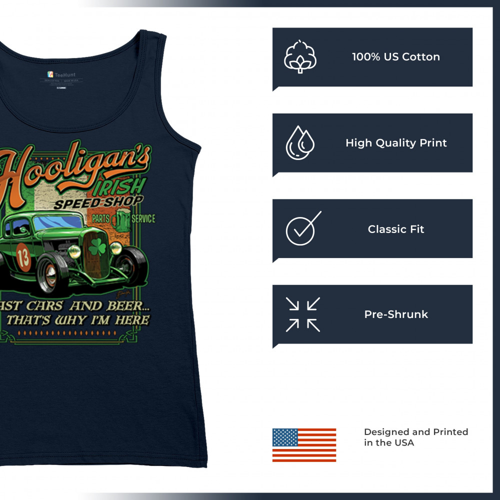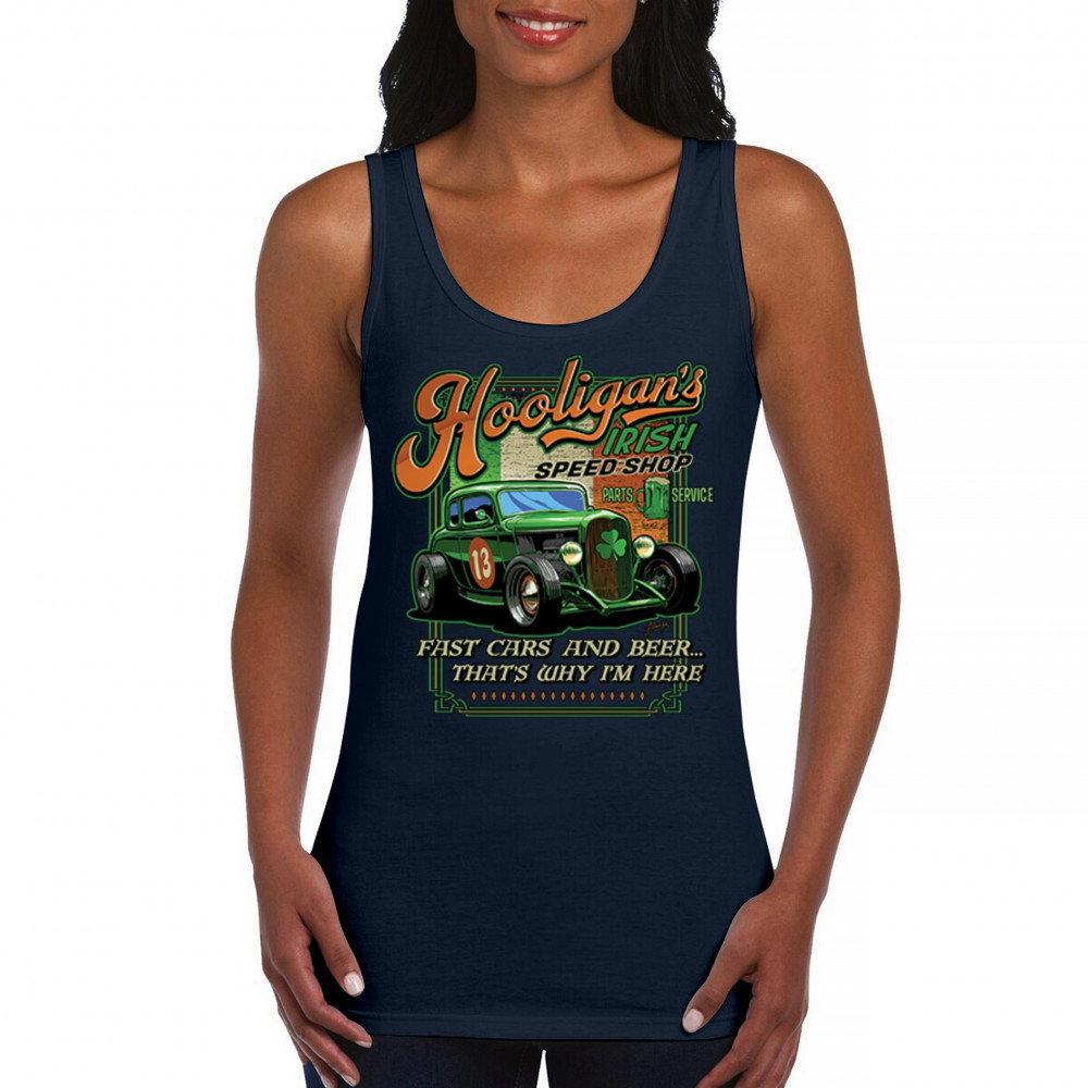 HOOLIGAN'S IRISH SPEED SHOP hooligans irish speed shop st patricks day women's tank top hot rod shamrock navy blue