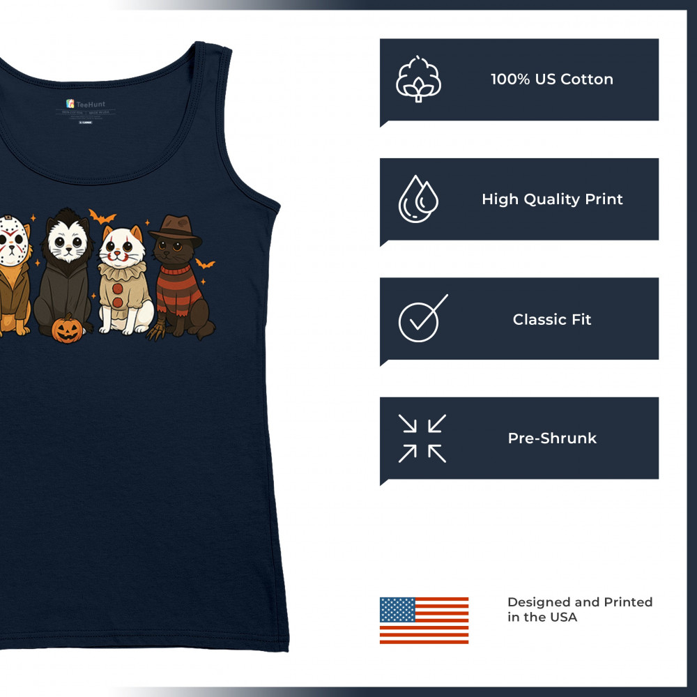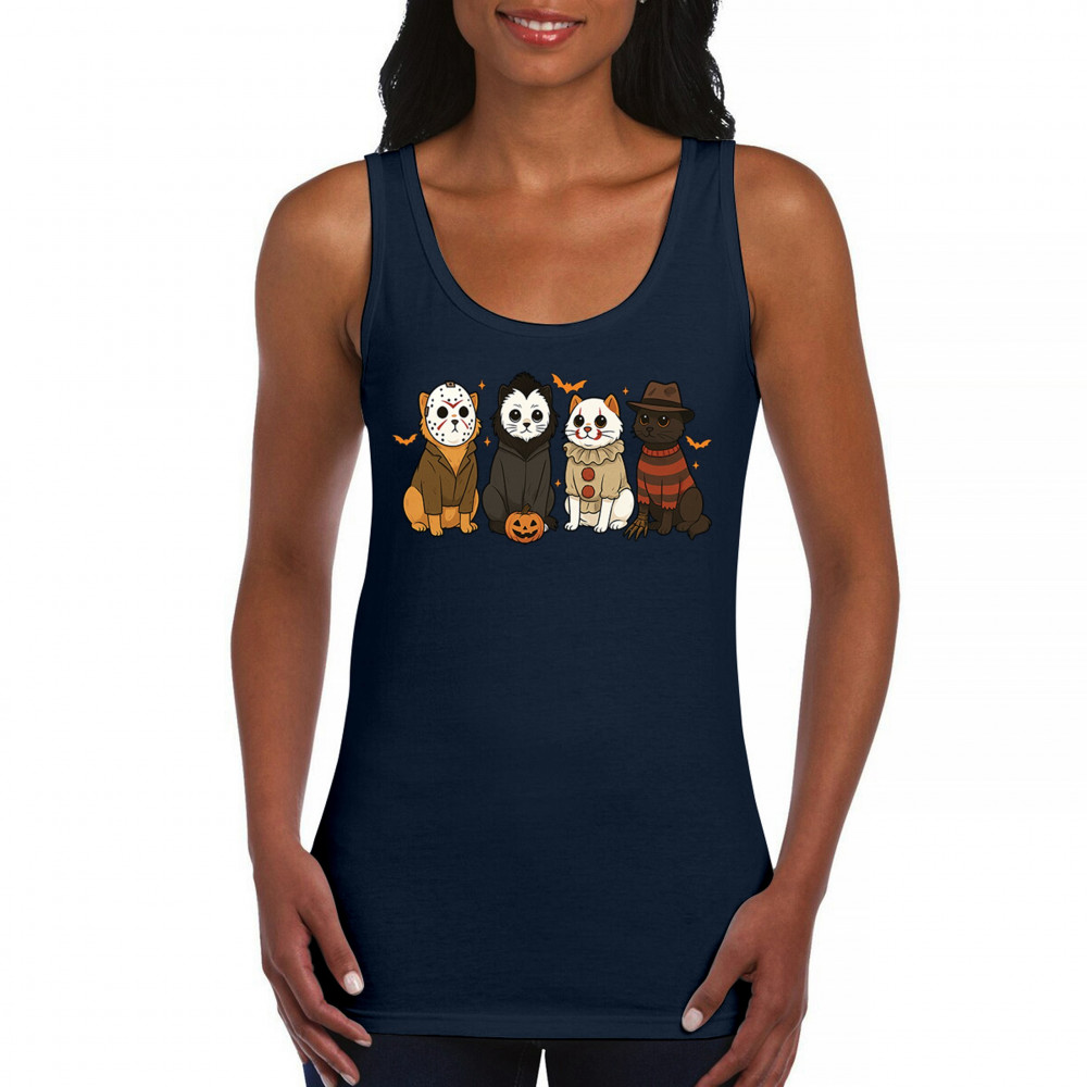 Horror Cats Halloween design with spooky costumes, Jack o Lantern details, and Haunted House vibes. Perfect October 31 outfit for cat lovers.