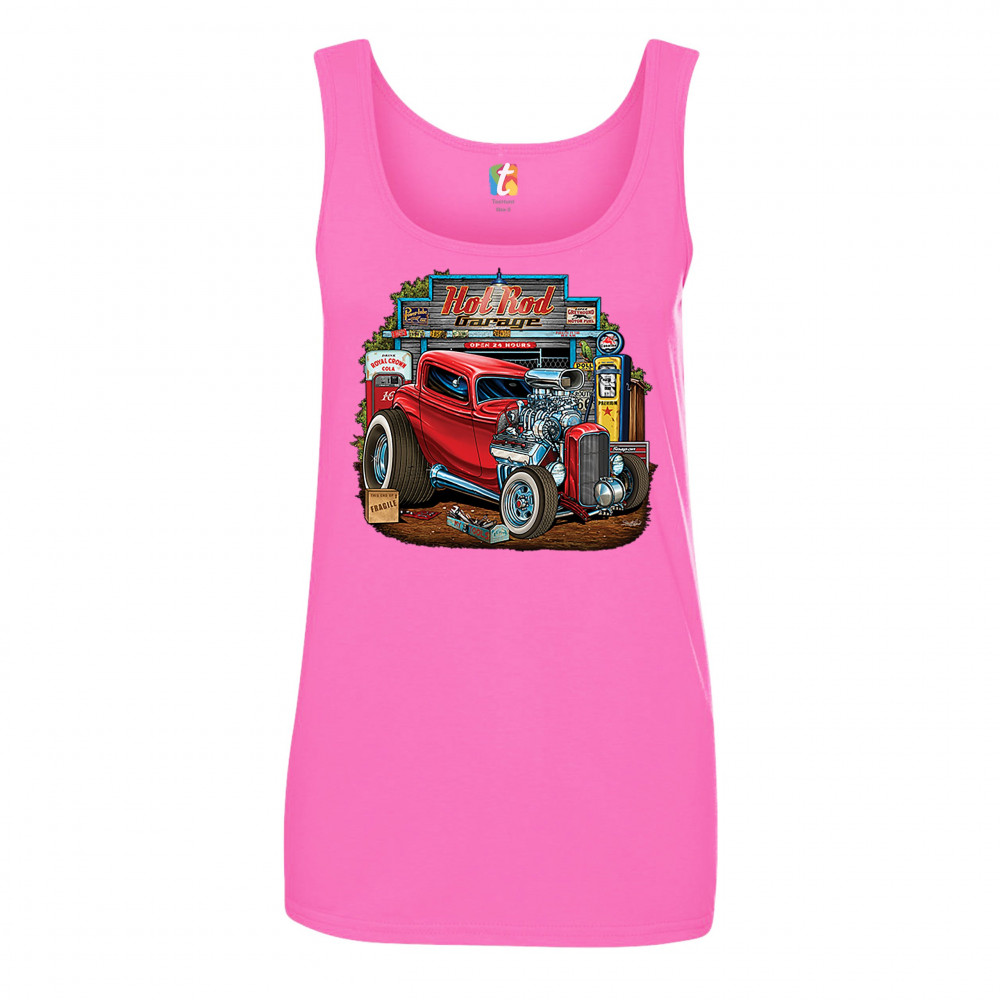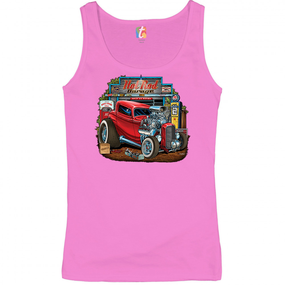 A print featuring a vintage hot rod with an exposed engine and plus-sized rear wheels. In the background there is a garage with a gas station and a sign that says: "Hot Rod Garage". A great choice for a fan of customized American classic cars and hot rods