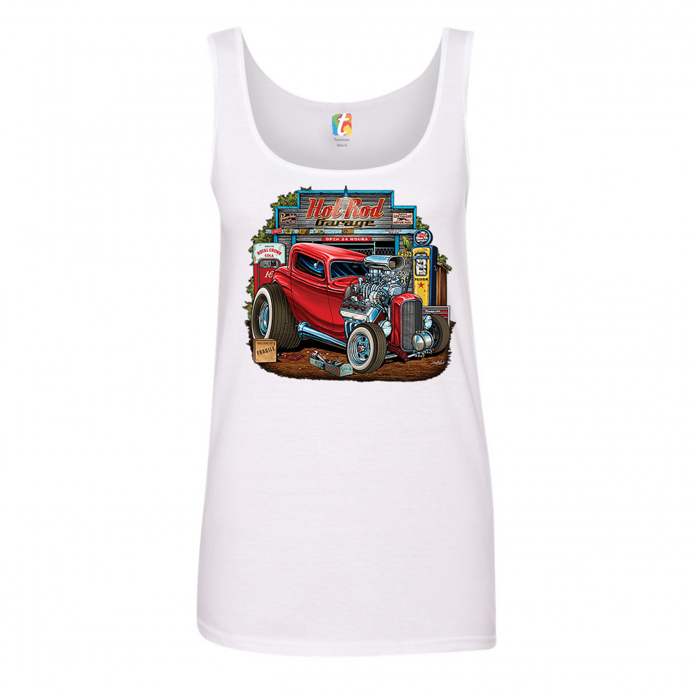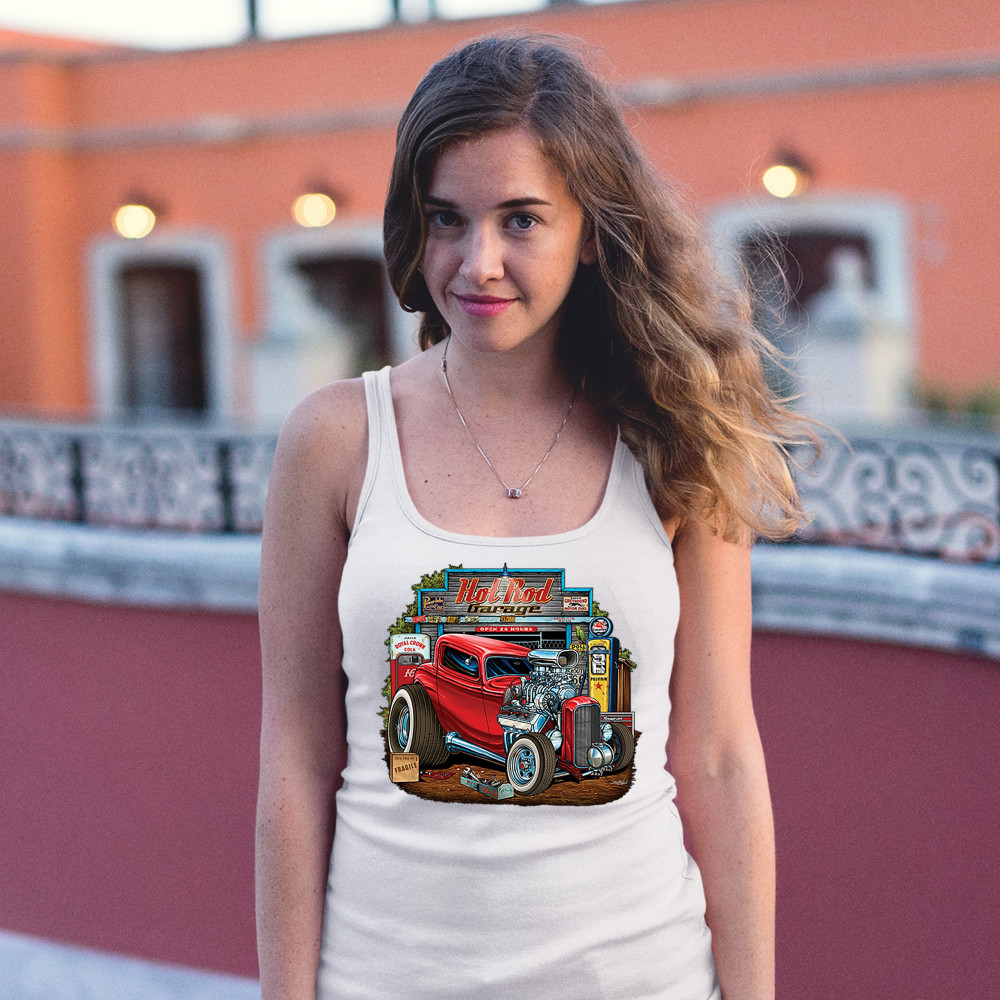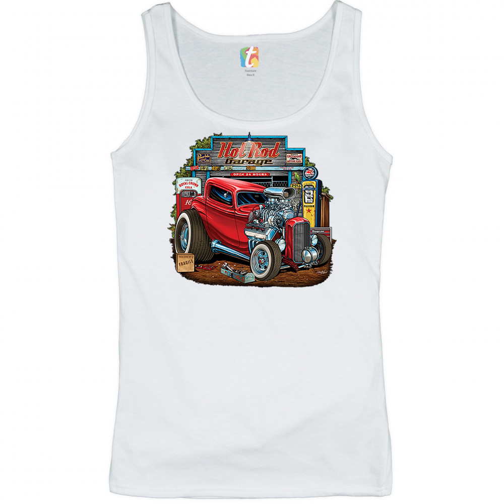 A print featuring a vintage hot rod with an exposed engine and plus-sized rear wheels. In the background there is a garage with a gas station and a sign that says: "Hot Rod Garage". A great choice for a fan of customized American classic cars and hot rods