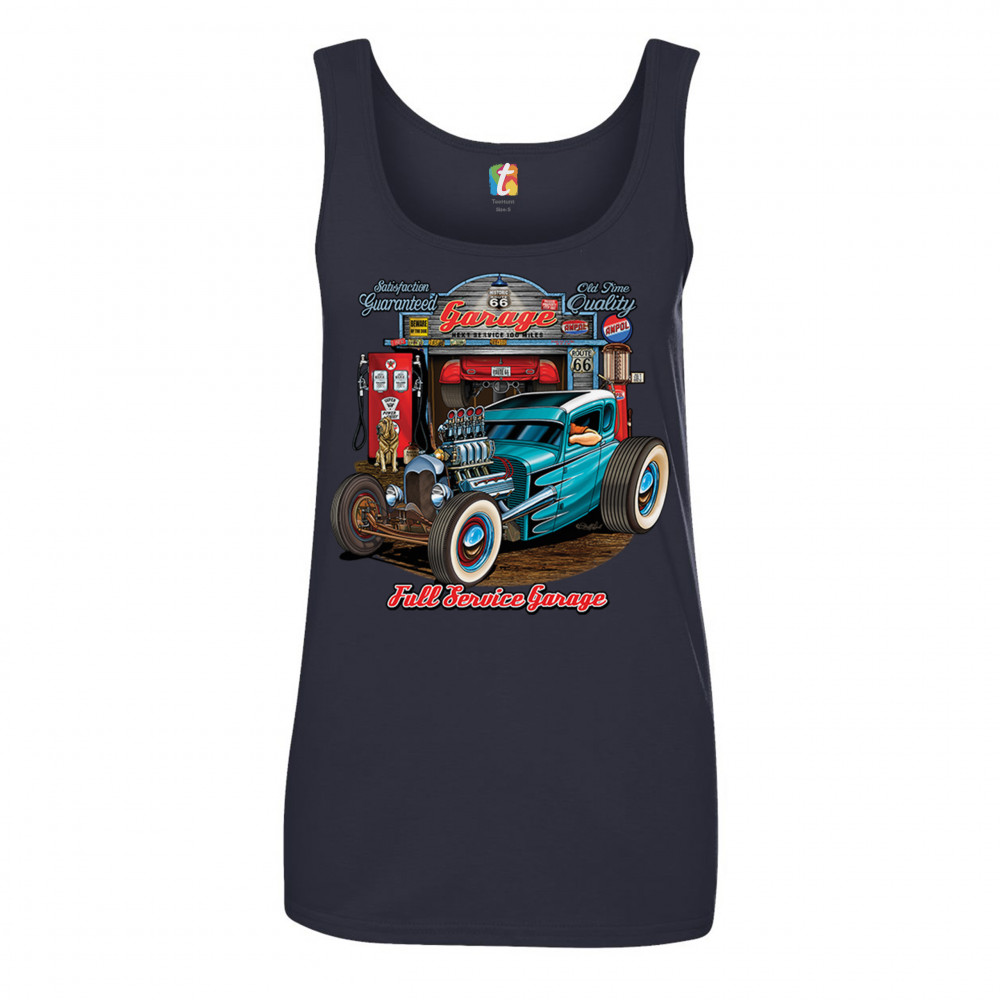A print featuring a beautiful blue hot rod and a garage behind it. The garage has numerous signs on it which says :"Satisfaction guaranteed", "Old time quality", "Historic Route 66". Under the car it says: "Full service garage". Great for Route 66 and hot rod fans.
