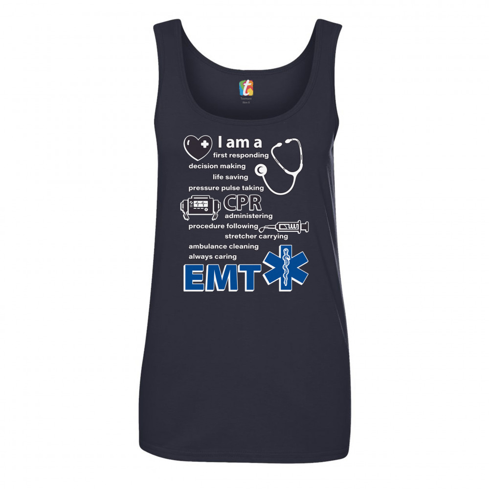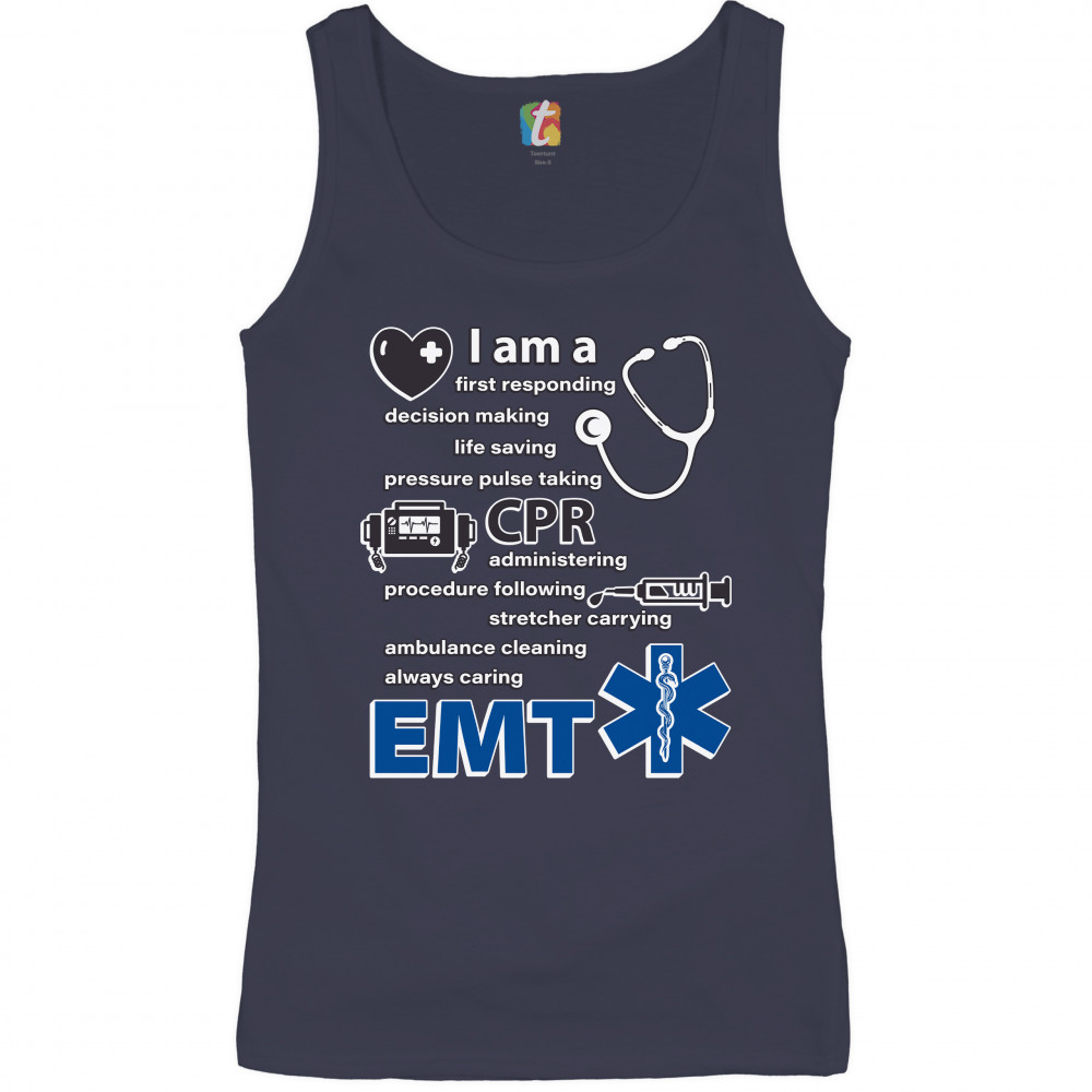 A print saying "I am a first responding, decision making, life saving, pressure pulse taking, CPR administering, procedure following, stretcher carrying, ambulance cleaning, always caring EMT". The print also features images of a heart, a stethoscope, a defibrillator, a syringe and the Star of Life. A great choice as a gift for a first responder.